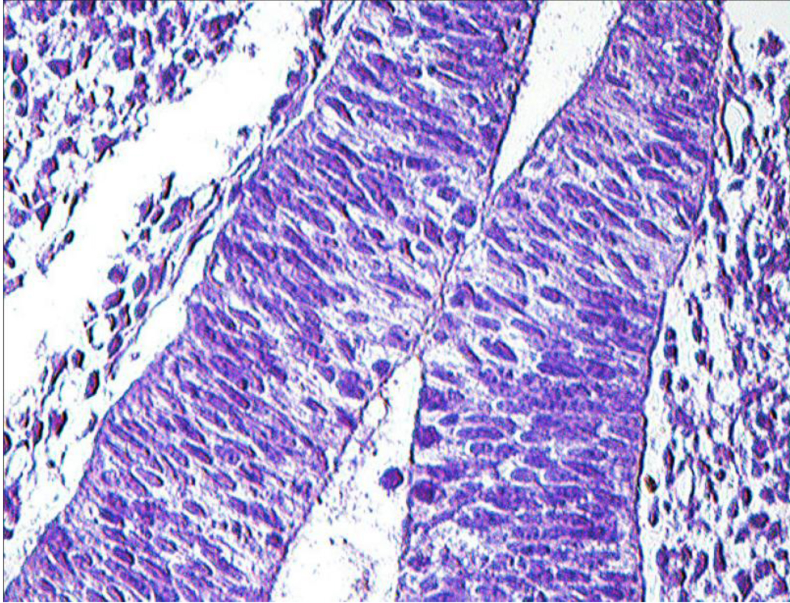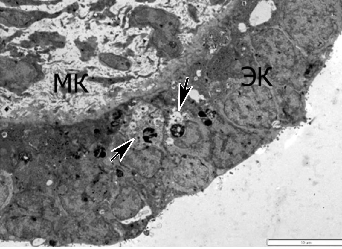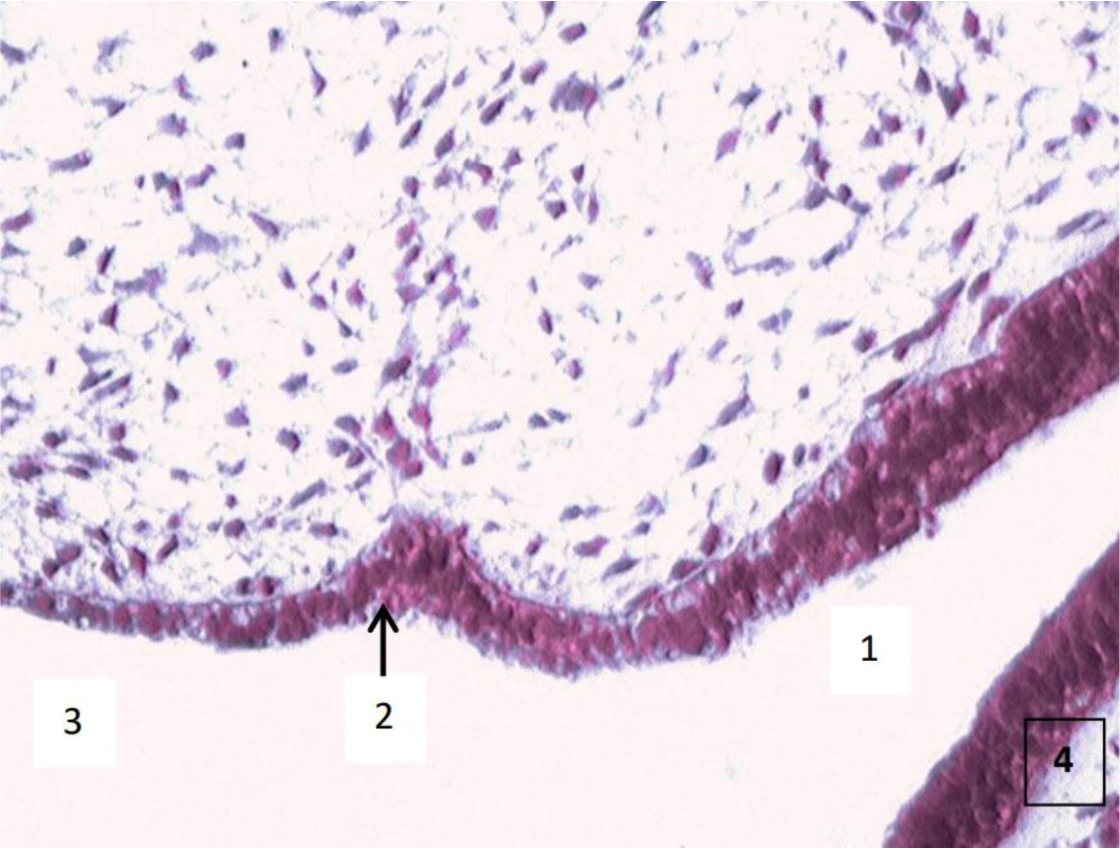 На заключительной стадии сомитного периода (14СК) КР представлен инвагинатом эпителия из полости стомодеума в зоне контакта со стенкой промежуточного мозга. Формирование КР сопровождается трансформацией эпителия из однослойного изоморфного в псевдомногорядный, многорядный мерцательный, многослойный плоский неороговевающий. В этой зоне инициируется процесс М. Наиболее демонстративно М проявляется в области перехода задней стенки КР в эпителий дорзальной стенки глоточной кишки. Дно КР приобретает бокаловидные контуры и обрастает воронку мозга (рис. 3).