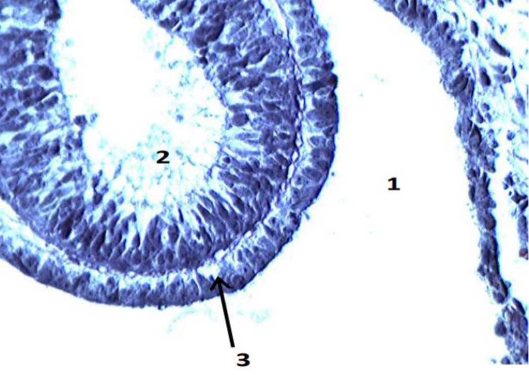 Карман Сесселя в гистологическом препарате ограничивает нарастающий пласт многослойного эпителия, который смещается с задней стенки КР на дорзальную стенку глоточной кишки. Перемещение многорядного эпителия по градиенту роста КР сопровождается активизацией апоптоза, пролиферацией клеток в составе пласта и мезенхиме, а также формированием эпителиоцитов качественно новой генерации, потерявших связь с базальной пластинкой эпителия и участвующих в восполнении дефектов в нишах апоптоза (рис. 4).