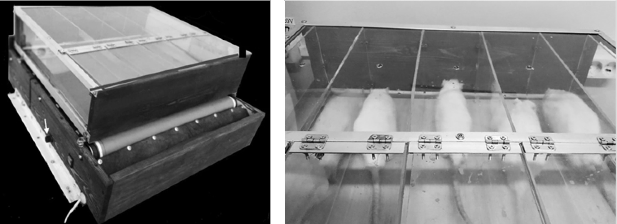 Исследование одобрено на заседании биоэтической комиссии ФГБОУ ВО РязГМУ Минздрава России (Протокол № 102, 2025). В начале исследования проводилась рандомизация животных методом таблицы случайных чисел. Отбор животных в опытную группу (ОГ) осуществляли путем бегового тренинга с применением беговой дорожки (рис. 1) со скоростью 2 км/ч до 10 мин. Крысы, не выполнявшие полноценный бег, были введены в контрольную группу (КГ). Крыс КГ (20 особей) и ОГ (15 особей) взвешивали на электронных весах Kitchen Scalt SF-400 (США).