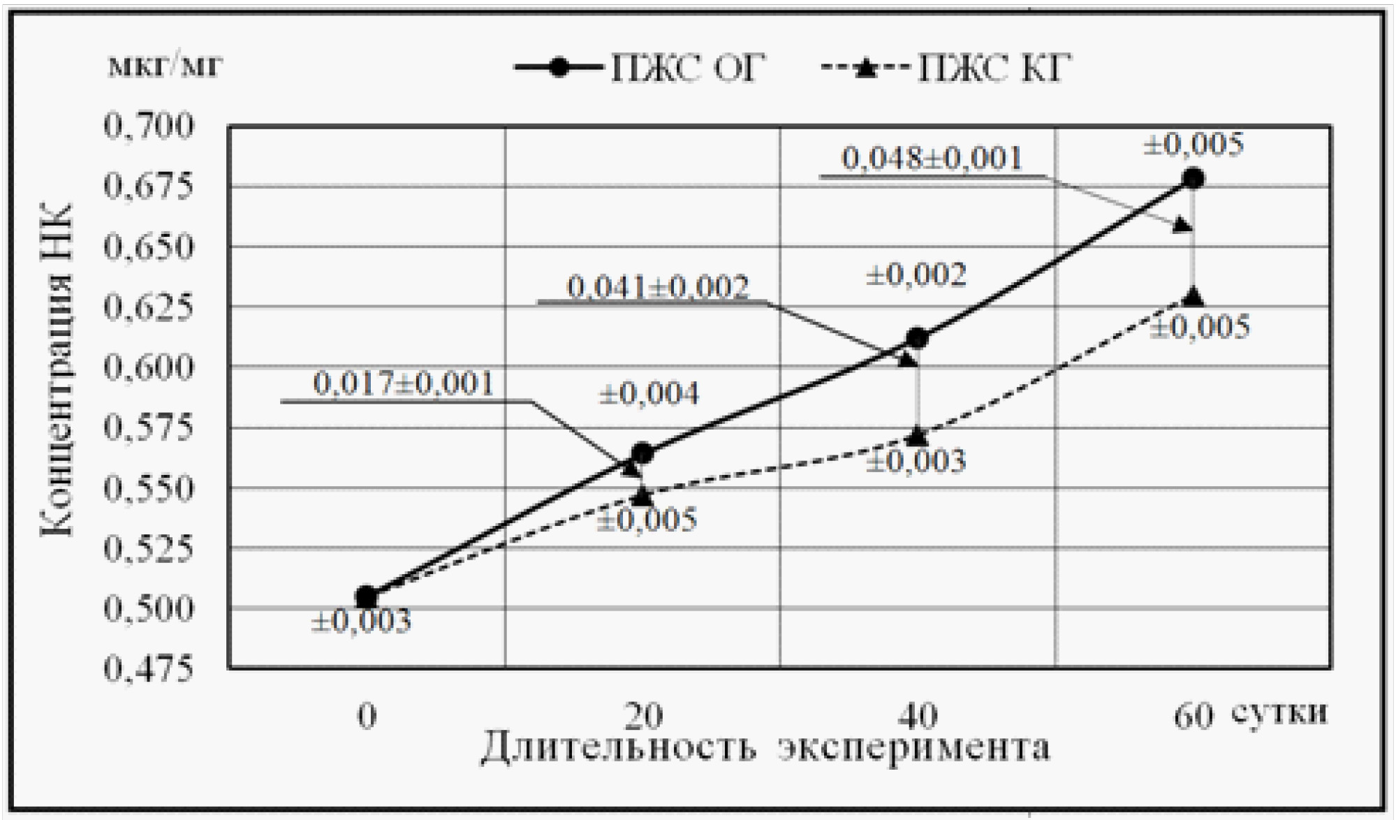 На 60-е сутки в миокарде ПЖС крыс КГ концентрация НК была (0,630 ± 0,005) мкг/мг, что больше в (1,102 ± 0,002) раза, на (0,058 ± 0,001) мкг/мг, 40-суточного показателя (rxy = 0,991; p = 0,001), и меньше в (1,101 ± 0,003) раза (rxy = 0,984; p < 0,001), чем в ЛЖС. В миокарде ЛЖС концентрация НК была (0,694 ± 0,003) мкг/мг, что больше в (1,097 ± 0,002) раза, на (0,061 ± 0,001) мкг/мг 40-суточного показателя (rxy = 0,949; p < 0,001).
