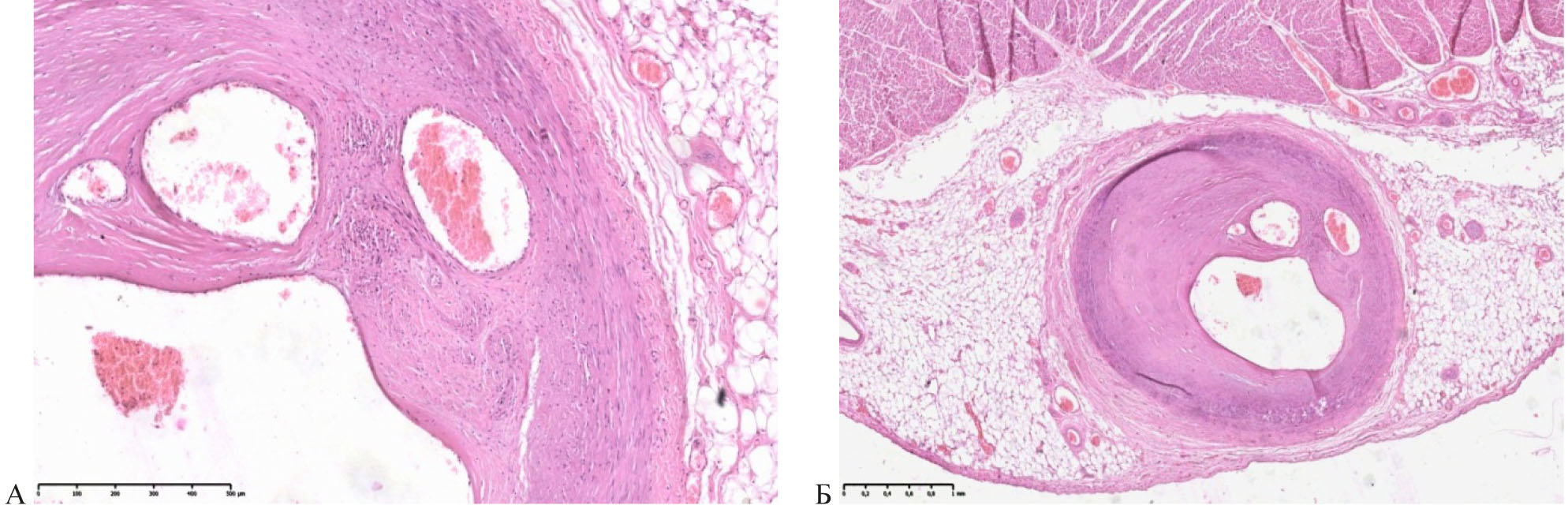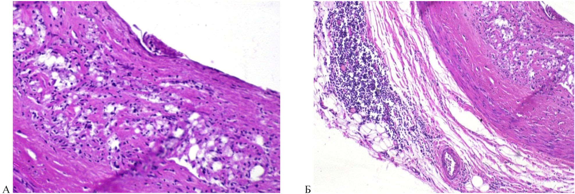 При атеросклерозе кровеносных сосудов в одних препаратах было выявлено утолщение интимы за счет избыточного содержания коллагеновых волокон(гиалиноз) с пылевидными кальцификатами (рис. 3А). В других препаратах в срезе стенки сосуда артериального типа интима неравномерно утолщена за счет отложения внутриклеточных липидов с формированием пенистых клеток, с единичными пылевидными кальцификатами (рис. 3Б). Окружающая жировая клетчатка с диффузно-очаговой круглоклеточной инфильтрацией (лимфоциты).