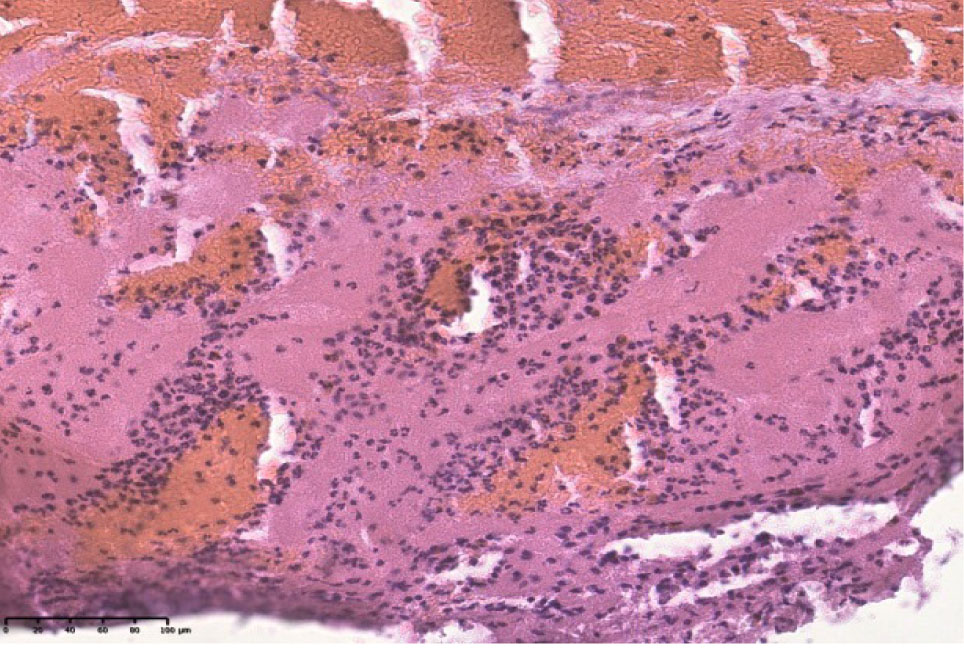 Еще одним морфологическим субстратом, определяющим клиническую картину ИБС, являются тромбы, способы и алгоритмы удаления которых до сих пор активно обсуждаются среди кардиои сосудистых хирургов. При макроскопическом изучении тромба было выявлено, что он темно-серого цвета в проксимальной трети, коричневого цвета с участками серого в средней трети и темно-коричневого цвета в дистальной трети. На пинцете тромб не провисает, при надавливании не крошится. При микроскопическом изучении фрагмент тромба был представлен скоплениями эритроцитов с диффузно-очаговыми лейкоцитами и гомогенными эозинофильными массами (рис. 5).