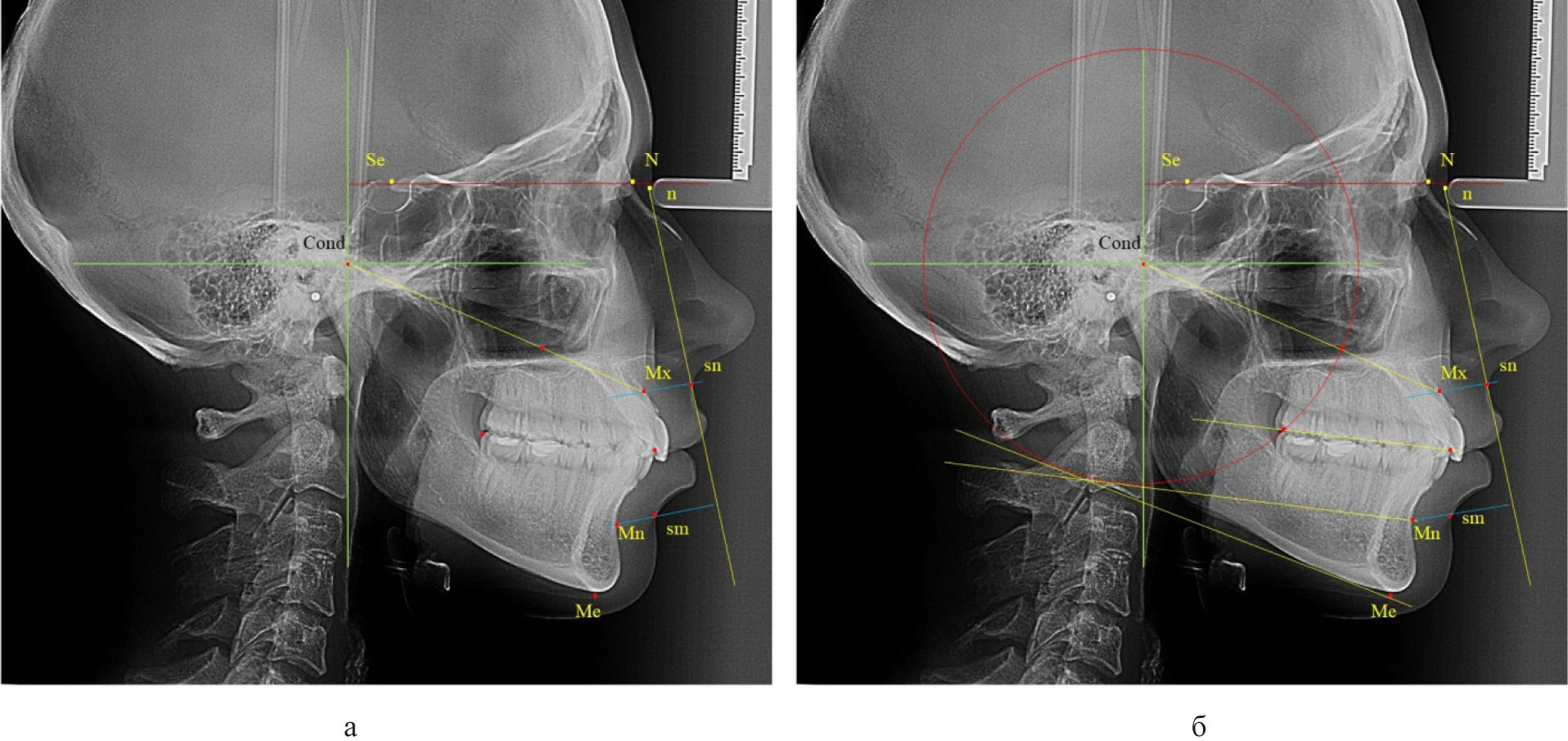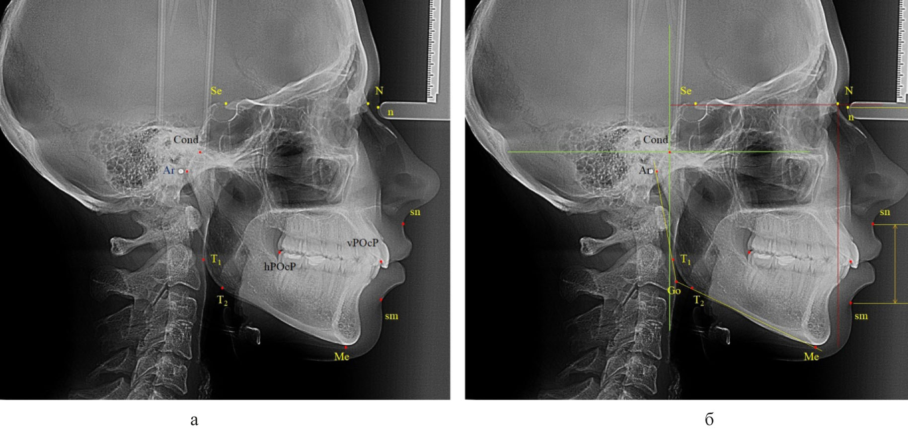 Рис. 2. Точки (а) и линии (б) для анализа угла нижней челюсти