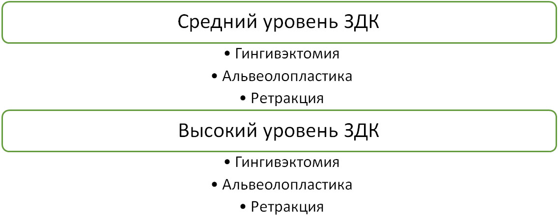 Основываясь на уровне зубодесневого комплекса, были сформированы группы, согласно методам проводимой терапии. I группа – контрольная (для получения нормированных параметров); II группа – со средним уровнем ЗДК, которым проводилось гингивэктомия – группа IIа (75 человек), группа IIб – альвеолопластика (80 пациентов), группа IIв – ретракция десны (76 обследуемых); III группа – IIIа – 28 пациентов, которым выполнена гингивэктомия, IIIб – 30 больных, проводилась альвеолопластика, IIIв – ретракция десневого края (31 пациент).