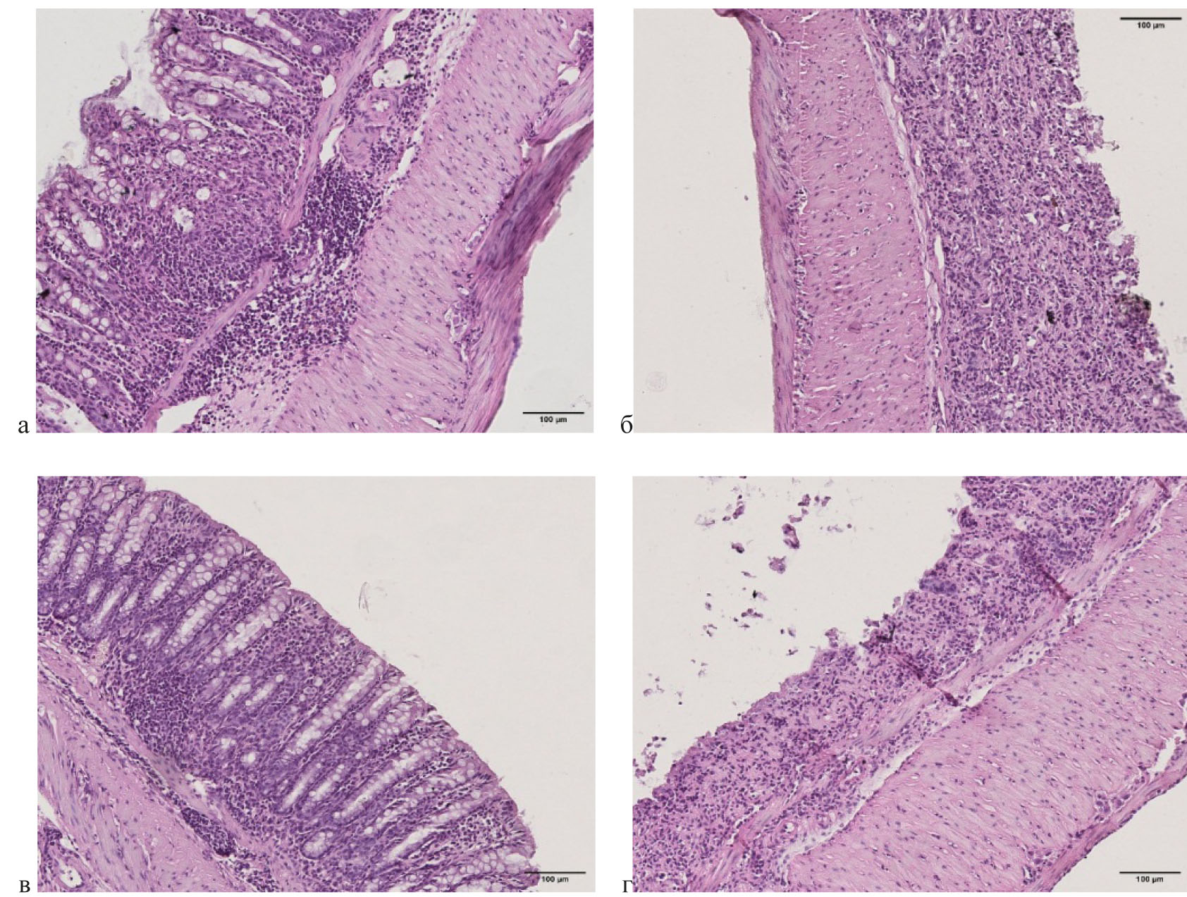 Рис. Язвы и инфильтраты ободочной кишки самцов мышей Balb/C с экспериментальным язвенным колитом: а – воспалительный инфильтрат в подслизистом слое, контрольная группа; б – язва слизистой оболочки ободочной кишки, контрольная группа; в – воспалительный инфильтрат в подслизистом слое, группа язвенный колит + мелаксен; г – язва слизистой оболочки ободочной кишки, группа язвенный колит + мелаксен. Бар – 100 µm. Окраска гематоксилин + эозин