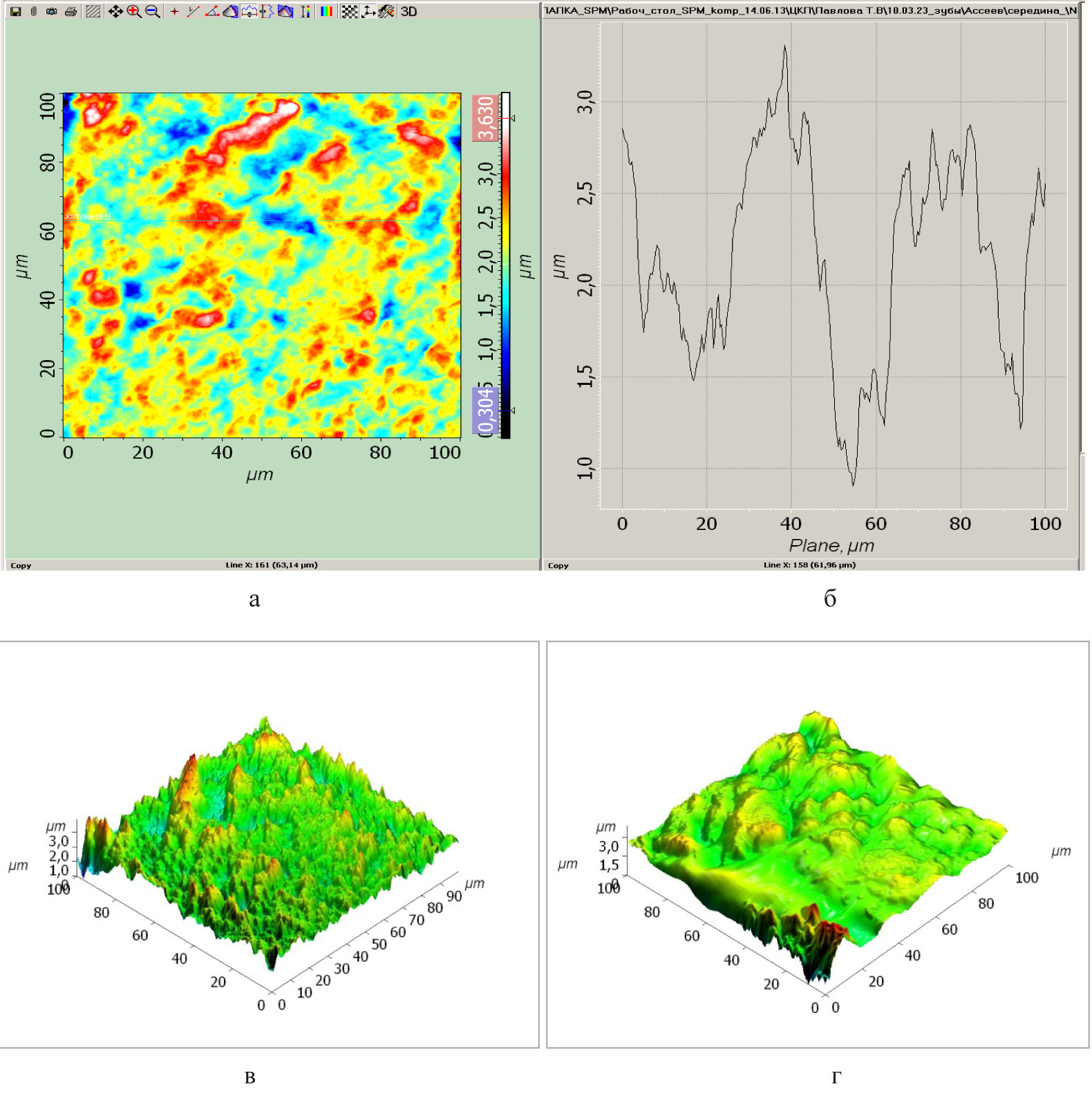 Рис. 2. Фрагменты коронки жевательного зуба 3.6 при СД 2-го типа. Эмаль. Отсутствие кариеса. Нарушение строение микрорельефа, особенно в районе корня зуба: а, б, в – атомно-силовая микроскопия коронки зуба; б – графическое изображение рис. 2а (двухмерное изображение); в – трехмерное изображение; г – корень (трехмерное изображение)