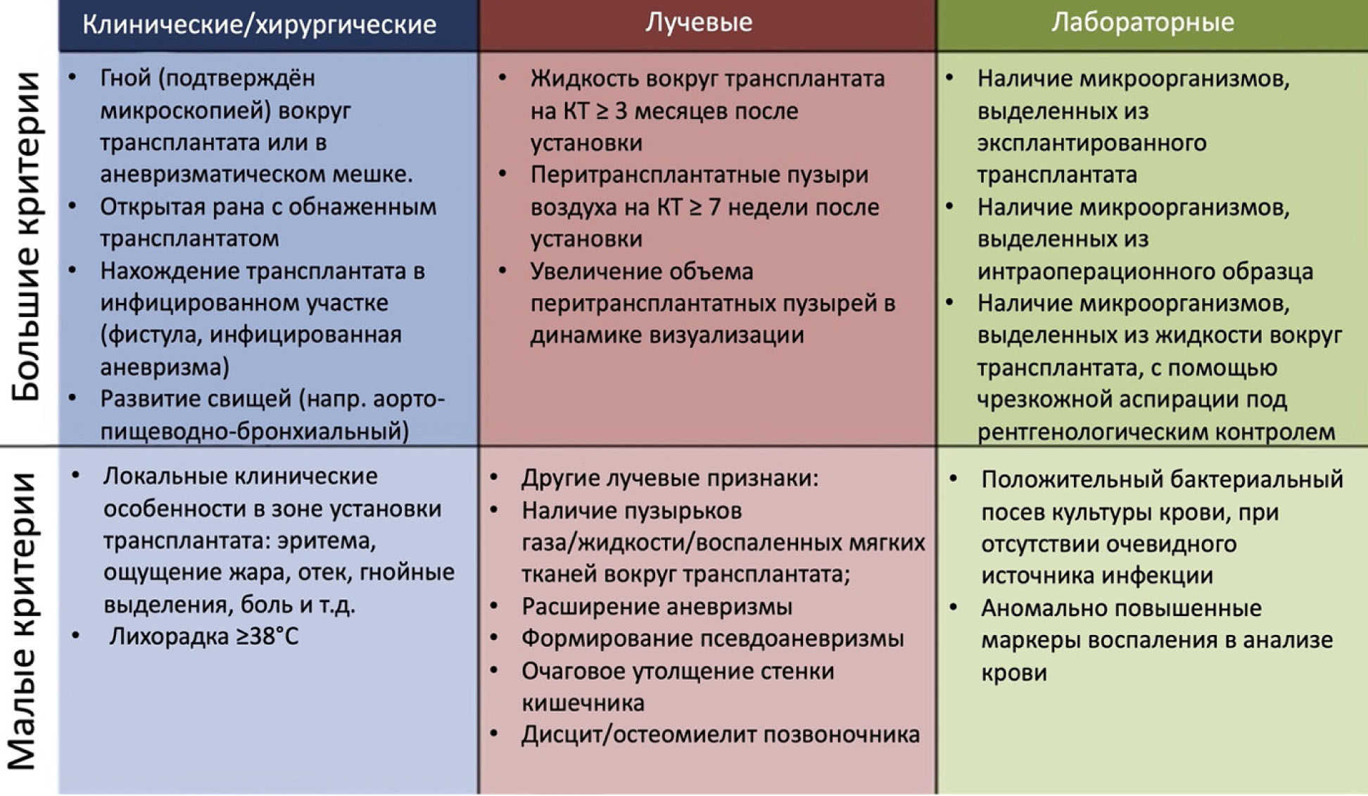 Рис. 1. Критерии для установления диагноза ИСТ. MAGIC – Management of aortic graft infection collaboration. Инфекцию сосудистого трансплантата подозревают у пациента при наличии одного большого критерия и двух-трех малых критериев из каждой категории
