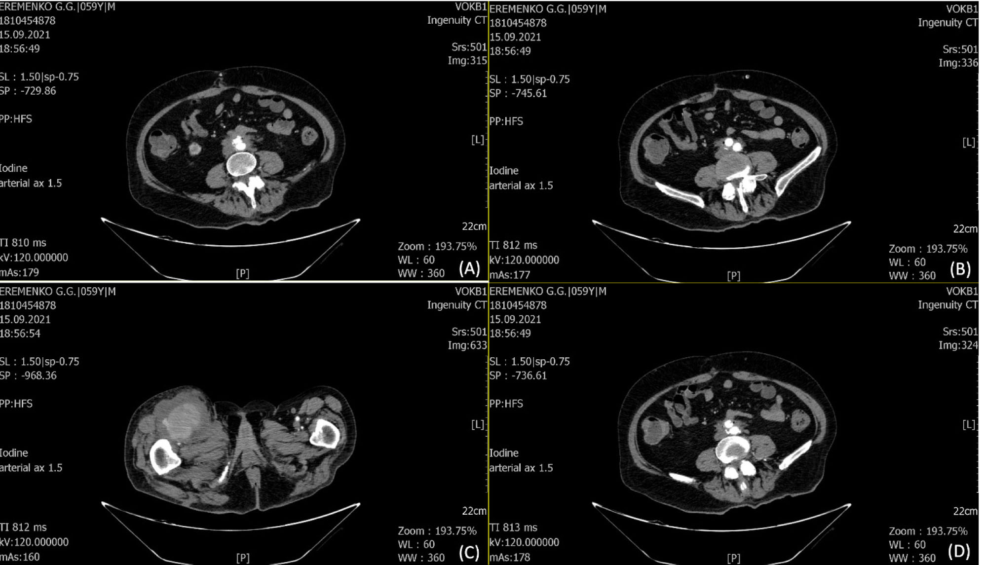 Рис. 2. КТА брюшной аорты и подвздошных сосудов – картина, характерная для ложной аневризмы с деструктивными воспалительными изменениями окружающей клетчатки (формирующийся абсцесс) (C). Не исключается парааортальный воспалительный процесс на уровне бифуркации за счет пакета увеличенных лимфатических узлов (A, B, D). Субокклюзия глубокой и поверхностной бедренных артерий справа