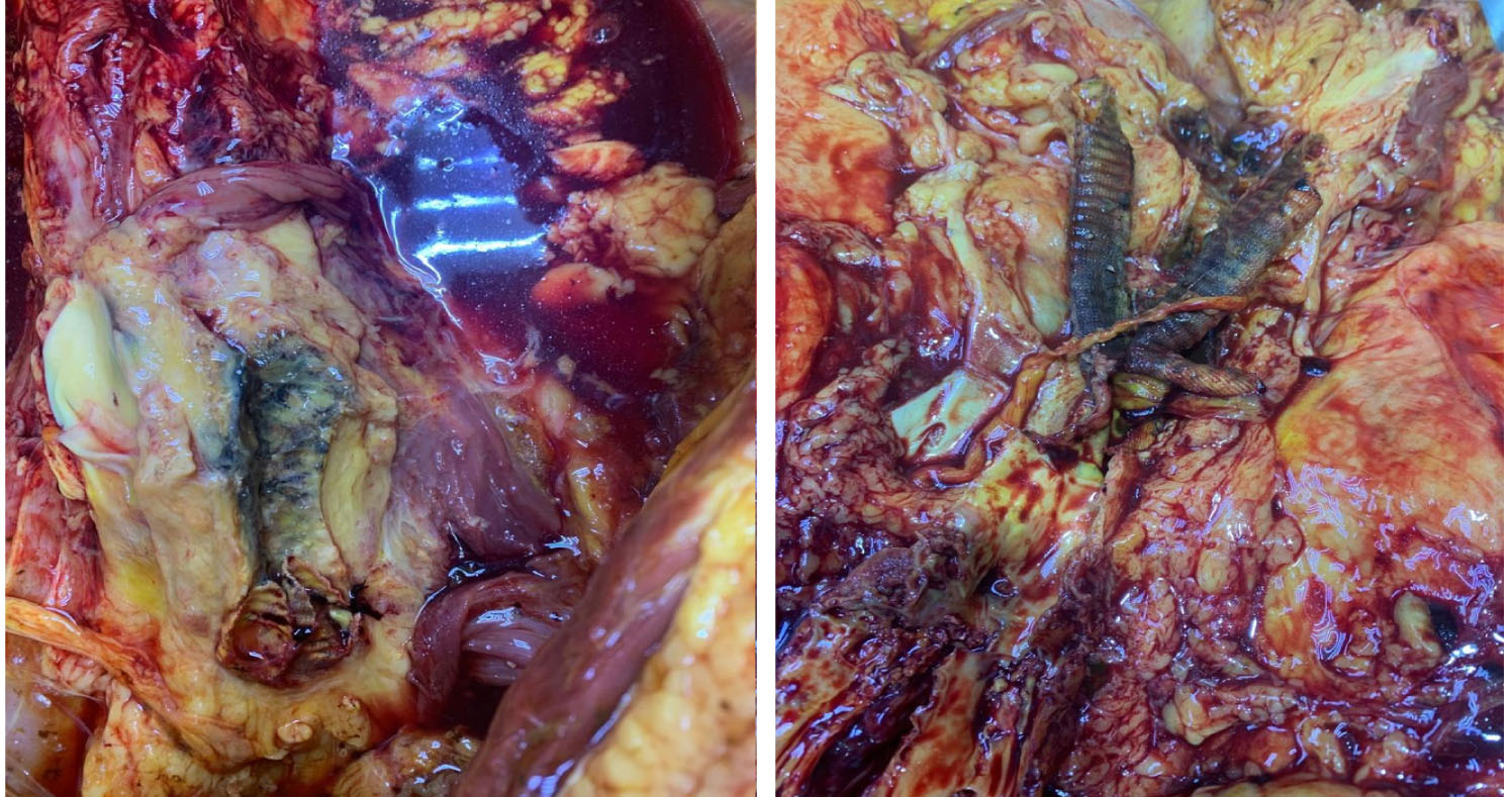 Проведен консилиум, по решению которого пациенту решено выполнить по жизненным показаниям высокую ампутацию нижней конечности с целью уменьшения площади всасывания инфекционно-токсических агентов, удаления источника гнойно-инфекционных процессов. В ходе операции обнаружены признаки флегмоны с затеком до тазобедренного сустава. После оперативного вмешательства пациент переведен в ОРИТ для дальнейшего лечения. Контроль лабораторных анализов от 26.12.2022 г. креатинин 183,5 мкмоль/л, WBC – 3,7 × 109, АсАТ – 76,96 Ед/л, билирубин общий 21 мкмоль/л. 27.12.2022 г. состояние больного тяжелое, без положительной динамики. Повязки на послеоперационных ранах промокли серозно-геморрагическим отделяемым с неприятным запахом. Пациенту накануне выполнялось переливание 3 доз эритроцитарных масс (Hb – 68 г/л). Продолжается динамическое наблюдение в условиях ОРИТ. 28.12.2022 г. состояние больного очень тяжелое с резко отрицательной динамикой, пациент переведен на респираторную поддержку ИВЛ. Отмечается увеличение креатинина да 318,8 мкмоль/л АсАТ – 103,1 Ед/л, билирубин общий 325,5 мкмоль/л. В 14 часов на кардиомониторе определяется асистолия, пульсация и дыхание отсутствует, комплекс реанимационных мероприятий не эффективен, констатирована биологическая смерть.