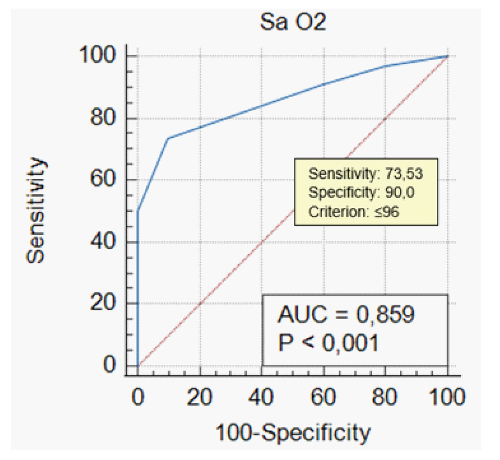 При построении ROC-кривой для всех значений SaО2 % после теста 6-минутной ходьбы была получена точка отсечения ≤96 % (AUC = 0,859, p < 0,001) (рис. 2). Чувствительность и специфичность данного параметра составили 73,5 и 90,0 % соответственно.