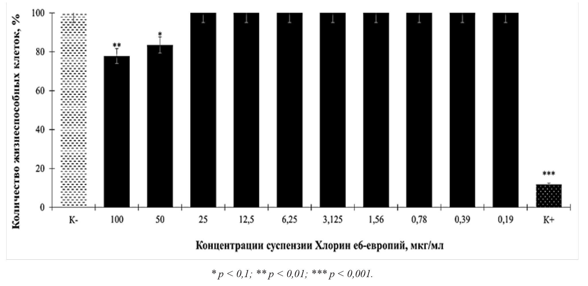 Рис. 1. Жизнеспособность клеток АКЭ через 2 сут. контакта с Хлорин е6-европий по данным МТТ-теста