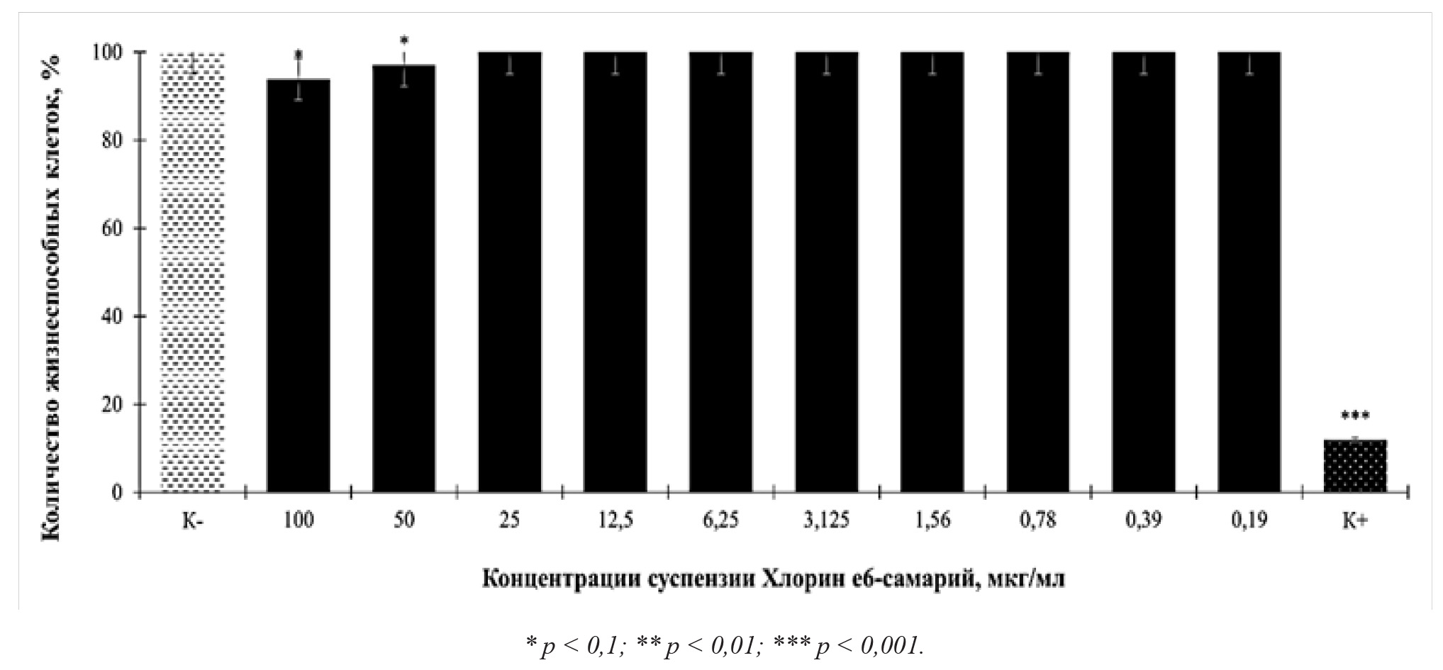 Аналогичные исследования темновой токсичности проведены для Хлорина е6, допированного самарием. Результаты демонстрируют высокую жизнеспособность для всего диапазона вносимых к культуре АКЭ концентраций: (97,80 ± 2,45) % для 100 мкг/мл (рис. 2).