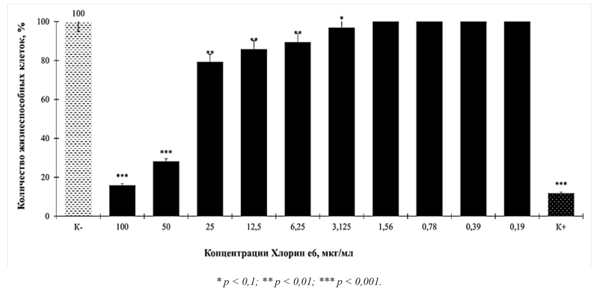 Следует отметить, что исследовалась также токсичность Хлорина е6 как контрольного вещества в условиях отсутствия непосредственного воздействия лучей света. Выживаемость клеток более 80 % отмечена для 12,5 мкг/мл, (85,85 ± 4,29) %, и ниже, при прежних значениях контролей. Наиболее токсичными оказались концентрации: 100; 25 и 12,5 мкг/мл. После контакта со 100 мкг/мл количество мертвых клеток составило (84,05 ± 4,20) % (рис. 3).