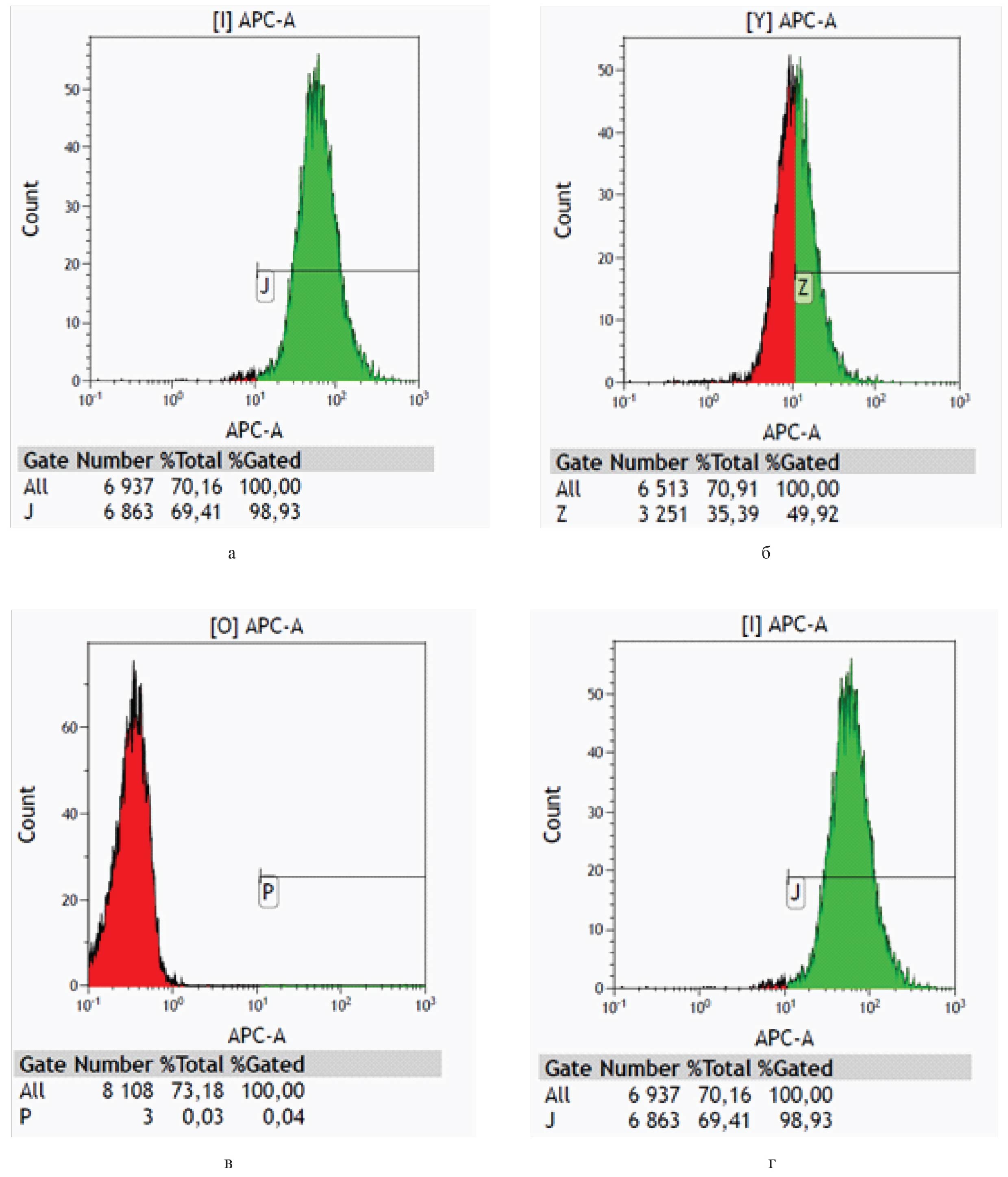 Рис. 4. Гистограммы интенсивности флуоресценции клеток аденокарциномы Эрлиха через 2 сут. контакта с: а) 25 мкг/мл Хлорин е6-европий; б) 25 мкг/мл Хлорин е6-самарий; в) интактными клетками (без внесения Chе6-Eu или Chе6-Sm); г) клетками положительного контроля (20 % ДМСО)