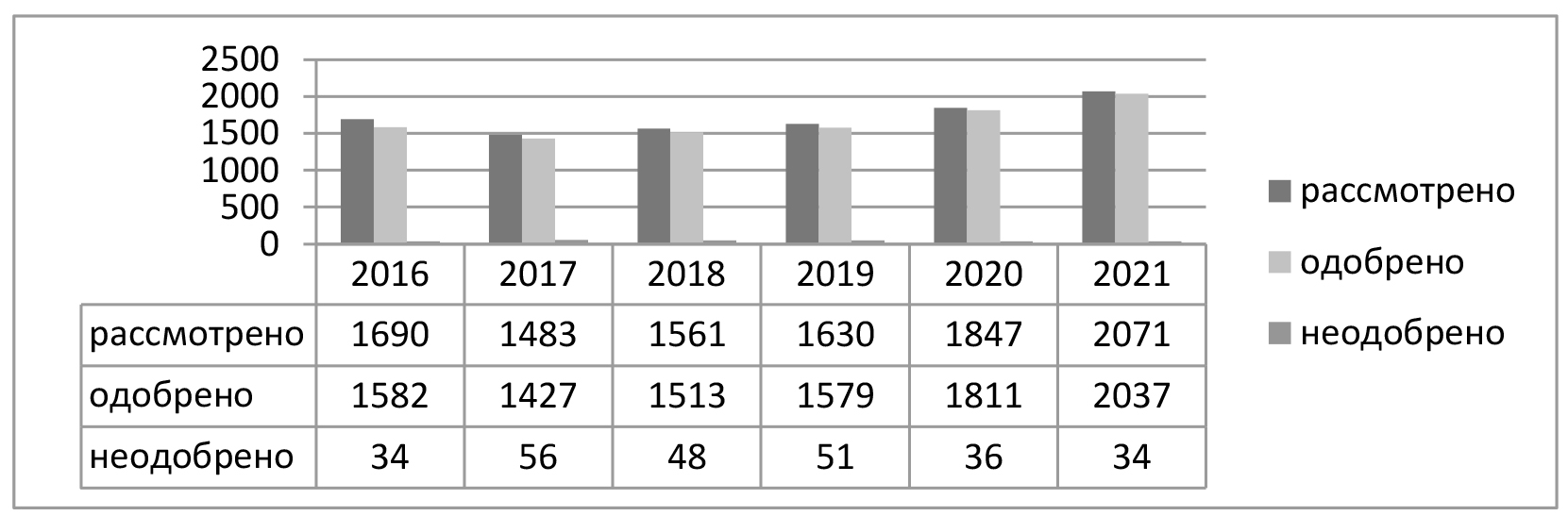 Рис. 2. Количество одобренных / не одобренных Советом по этике заявок на проведение клинических испытаний за 2016–2021 гг.