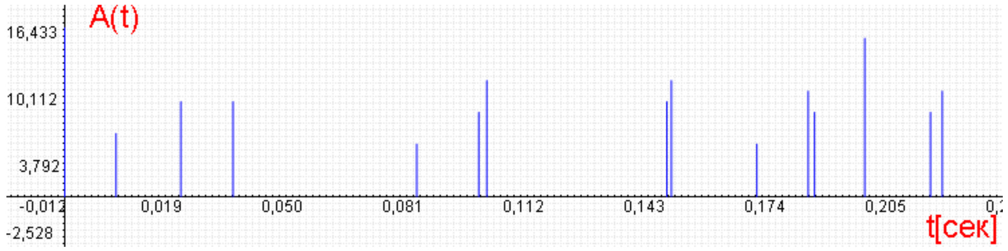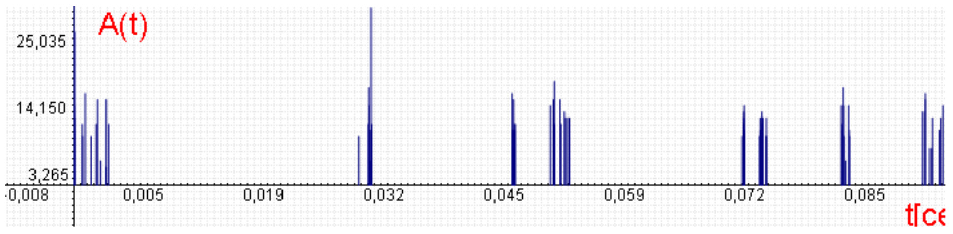 - Все заявки пачки в одной точке. Генерируется количество заявок mi в очередной пачке из распределения емкости пачки (фиксировано, экспоненциально или по Пуассону) с параметром m1. Все эти заявки записываются с одинаковым текущим временем. Пример для набора параметров {λ1=50, m1=10, P1=1, ρ=0.1} и Пуассоновского распределения размеров пачек показан на рисунке 4 (здесь и далее приведены скриншоты из программного комплекса АМС [9]). На графике – число заявок на интервале обслуживания.