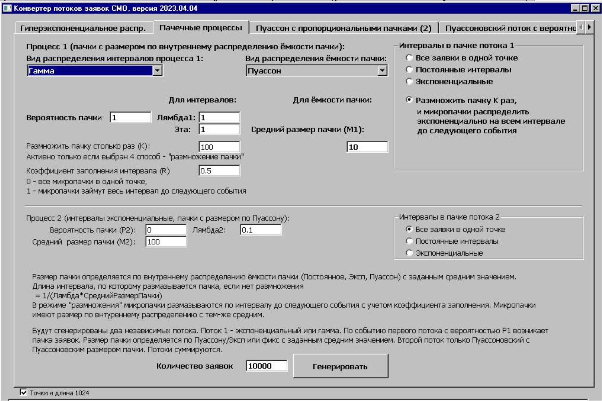 По рассмотренным выше алгоритмам был создан конвертор генерации групповых потоков заявок. Конвертор воспроизводит последовательности чисел, отражающих моменты времени появления каждой из заявок. Если поток не ординарный, и одновременно появляется несколько заявок, то число, отображающее указанный момент времени, повторяется столько раз, сколько заявок поступило в этот момент.
