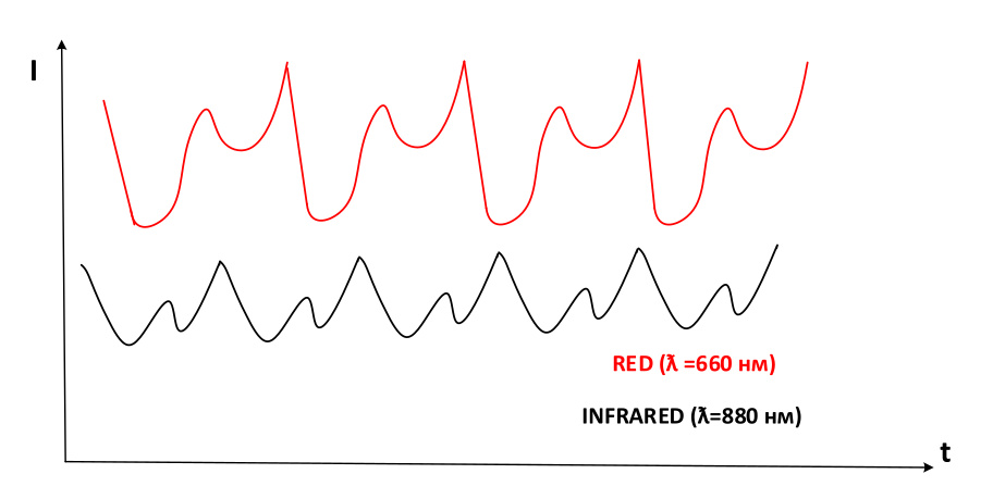 Sp – это обозначение процента кислорода, который содержится в крови. Определяется данный процент как отношение насыщенного кислородом гемоглобина (HbO2) в процентах к общему содержанию гемоглобина (HbO2 + RHb), определяемых с помощью фотодетектора, ИК и красного светодиода MAX30102 [8]: