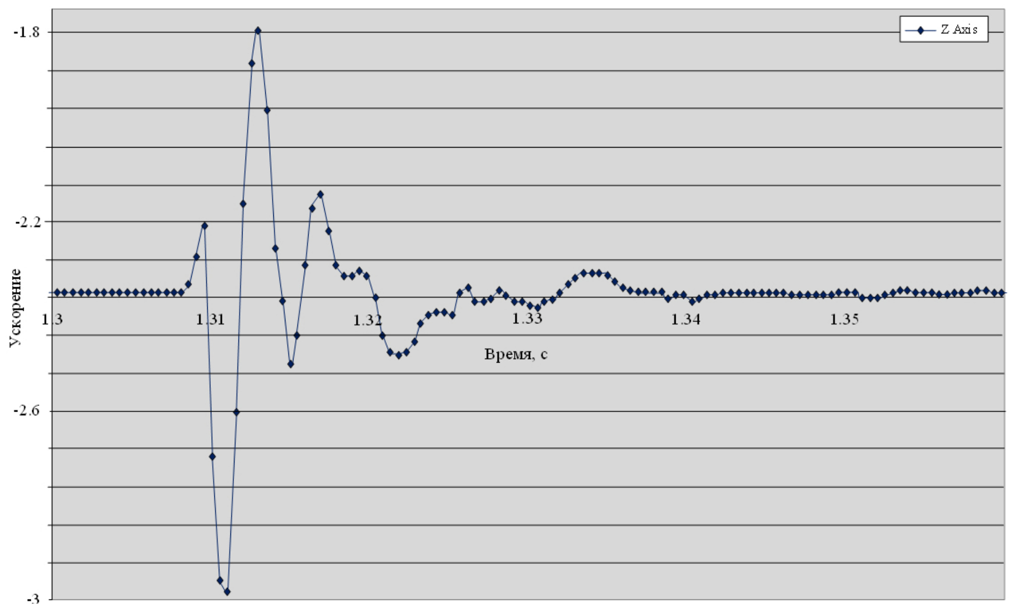 Рисунок 8. Высокочастотный всплеск сигнала при легком ударе по оси Z