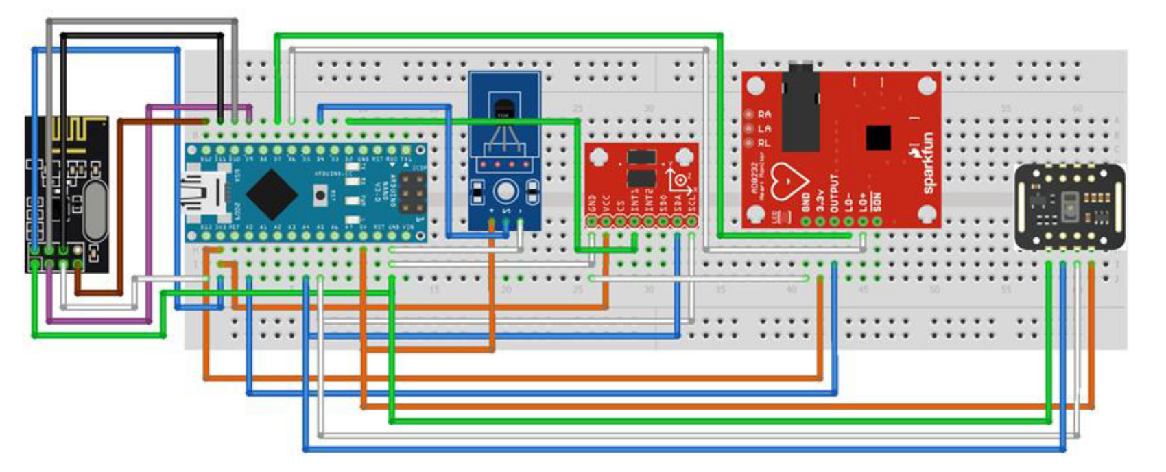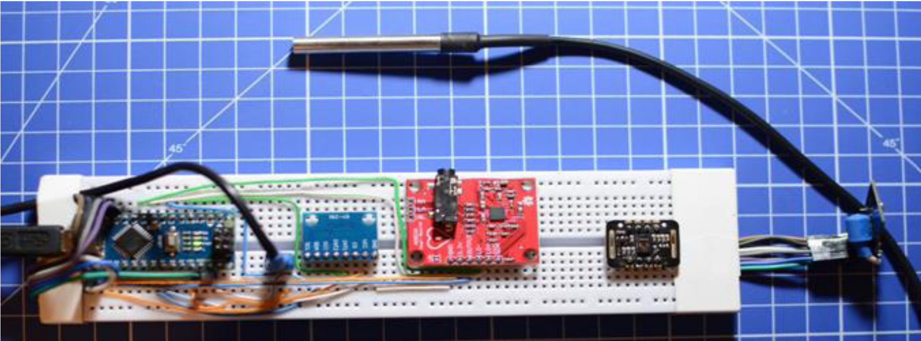 На данной схеме показан макет соединения датчиков с контроллером ArduinoNano. На рисунке 14 приведена фотография собранного макета. Полученный макет работает от напряжения 5В, получаемого от microUSB, благодаря чему его можно запитать от любого портативного аккумуляторного зарядного устройства для зарядки обычных смартфонов.