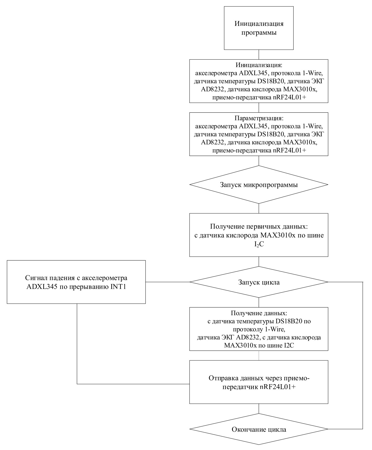 Загружаем необходимые библиотеки в ArduinoNano, далее прописываем переменные среды для работы. Сигналы, считываемые с датчиков кислорода, температуры, акселерометра (играет роль датчика падения человека), распределяя по группам, передаем по радио модуля на 2 плату Arduino ATmega2560.