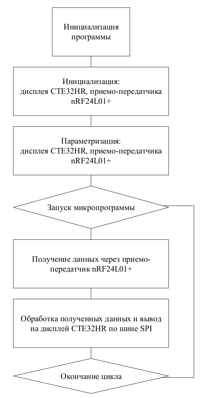 Разработанная логика функционирования передатчика представлена в виде алгоритма (рисунок 16). Данный алгоритм показывает логику работы передатчика от инициализации программы, циклического опроса датчиков до передачи полученных данных в радиоканал. На рисунок 17 показана логика работы приемника.