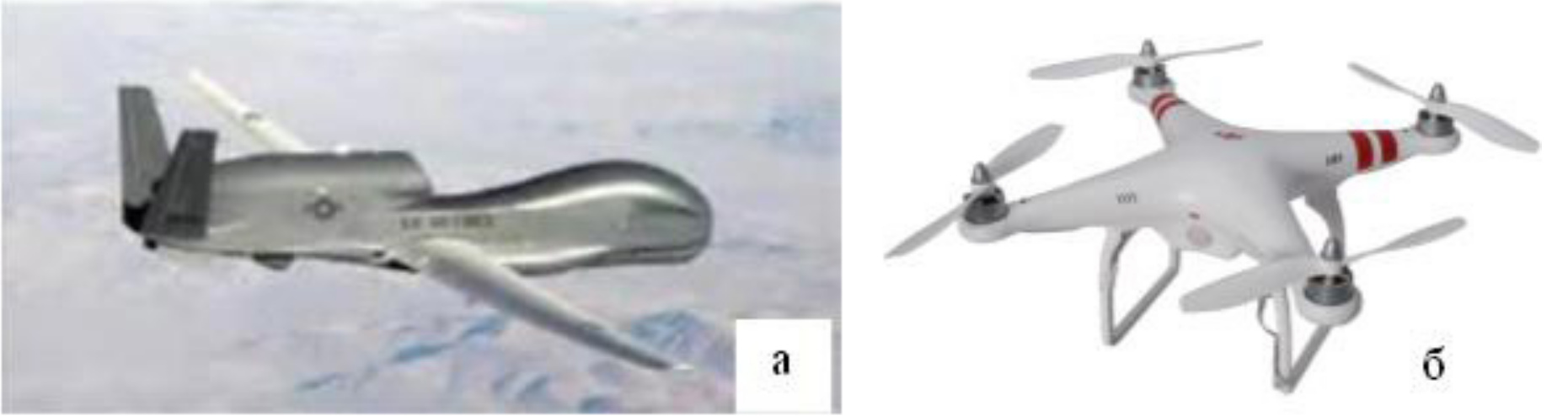 Рисунок 1. БПЛА самолетного типа (а) и мультироторный (б)