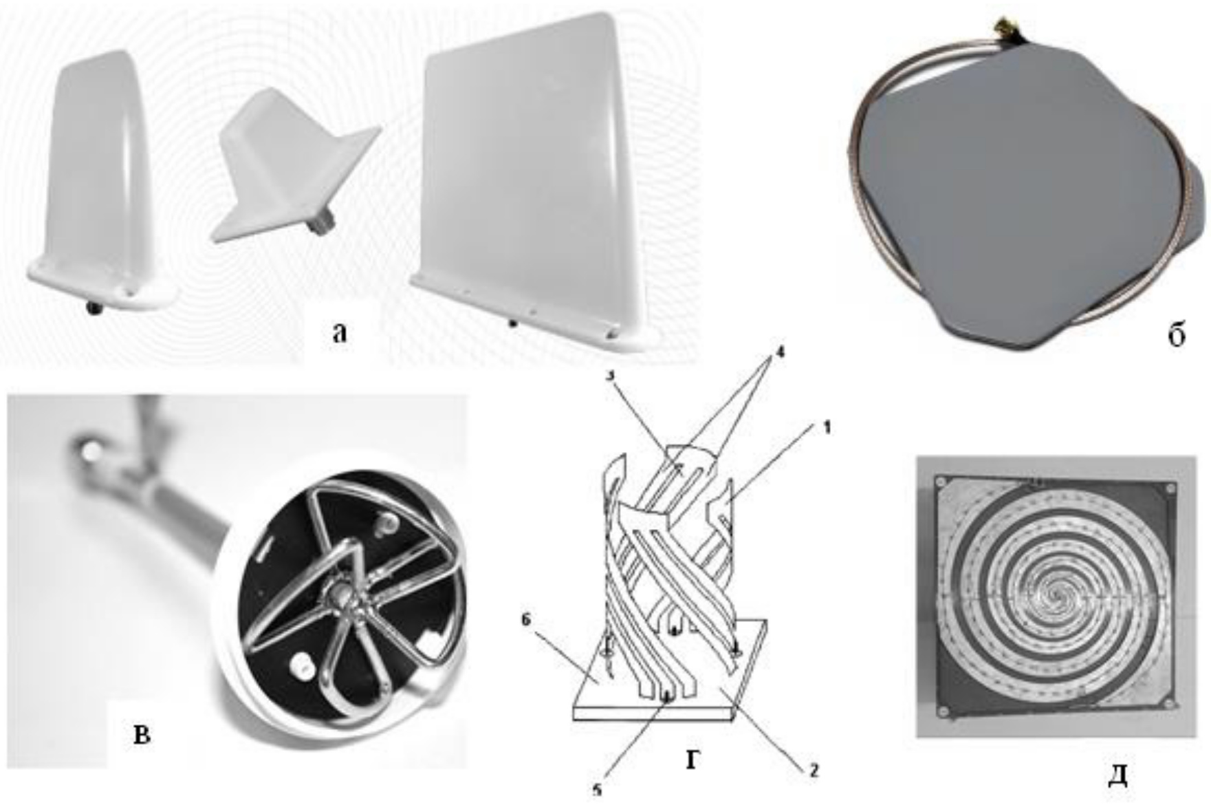 Спиральные антенны (рисунок 2 в, г, д) реализуют круговую поляризацию радиоволн и способны обеспечивать хорошие направленные свойства или (при снижении требований к коэффициенту усиления) быть достаточно широкополосными.