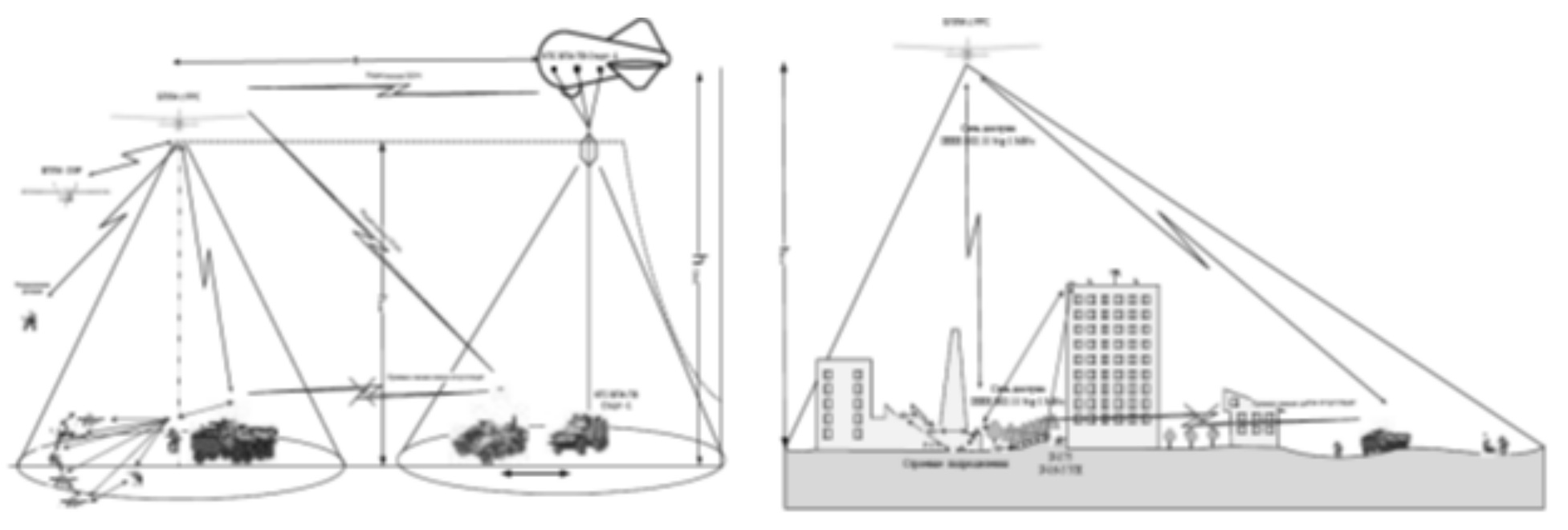 Как уже было отмечено выше, одной из распространенных функций аппаратуры полезной нагрузки БПЛА является ретрансляция данных между удаленными абонентами сетей связи. При этом ретрансляторы на БПЛА могут использоваться как самостоятельно, так и в составе группировки, а также в сочетании с другими средствами ретрансляции (рисунок 3) [9].