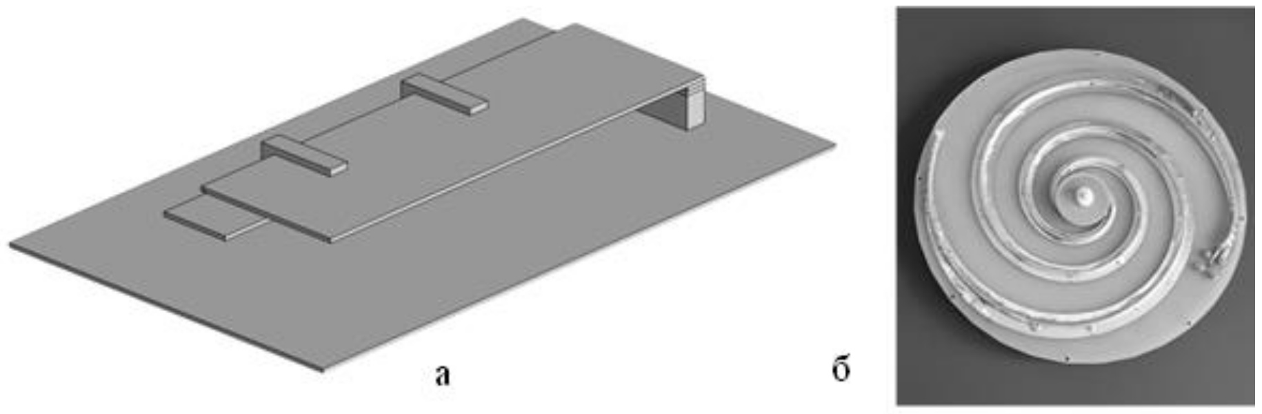 Рисунок 4. Излучающие структуры низкопрофильной (а) и спиральной (б) антенн для ретрансляторов на БПЛА