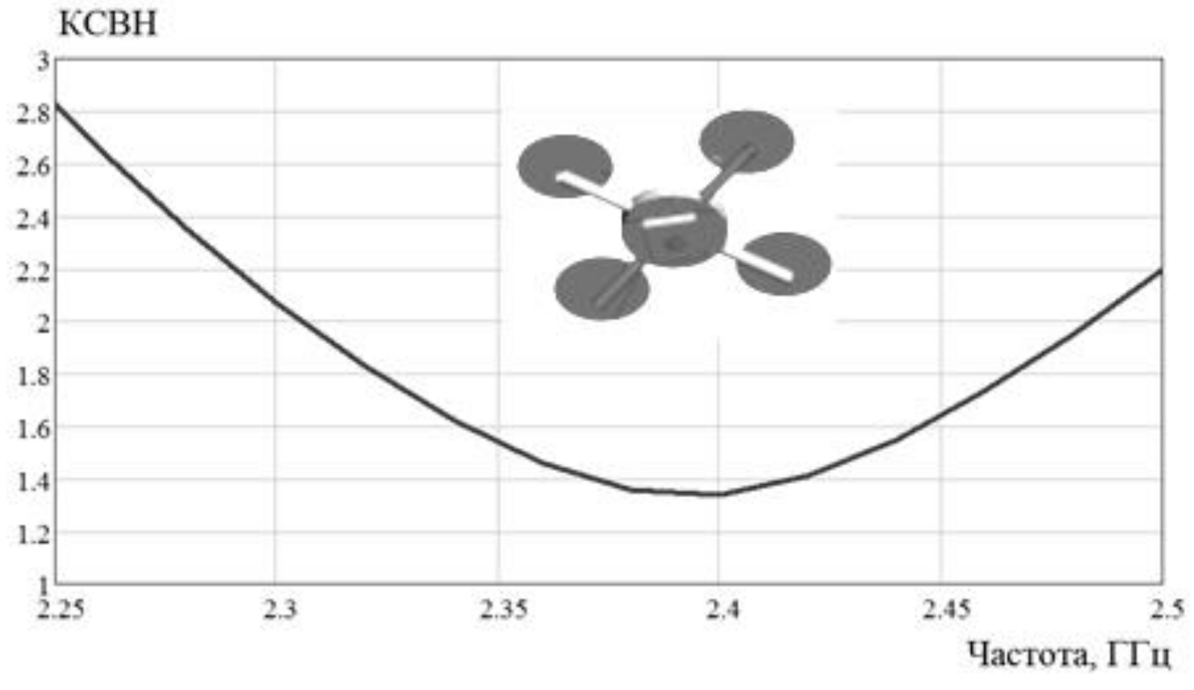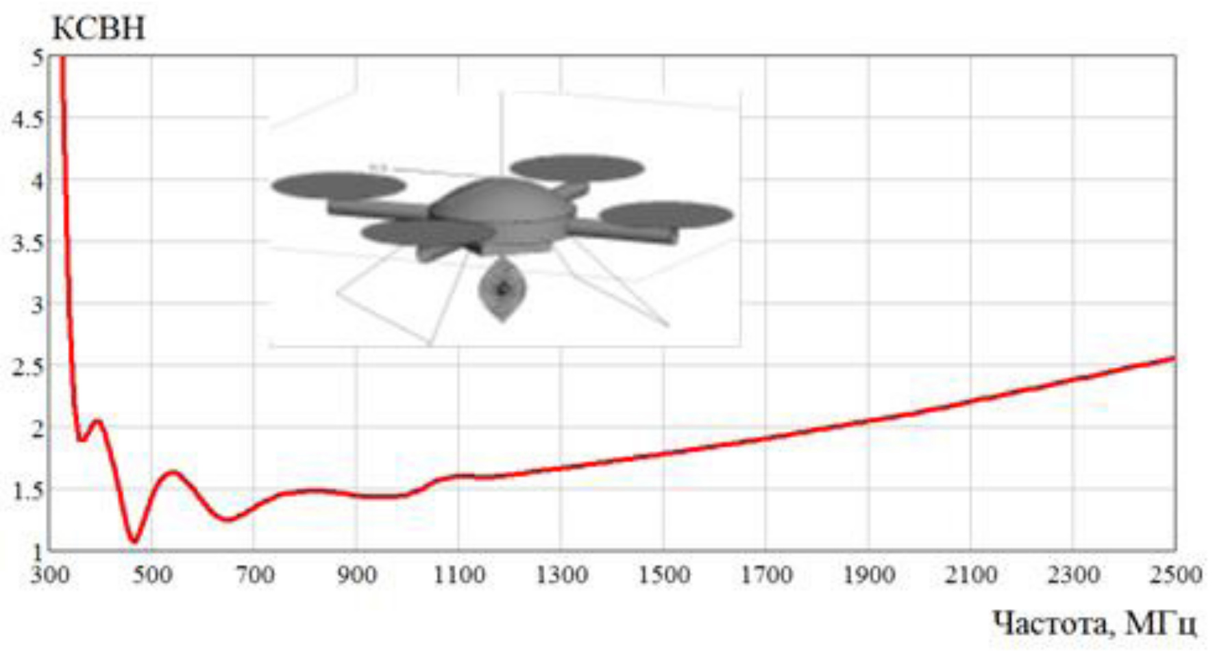 На рисунке 5 приведена характеристика коэффициента стоячей волны напряжения (КСВН) низкопрофильной антенны, установленной на БПЛА.