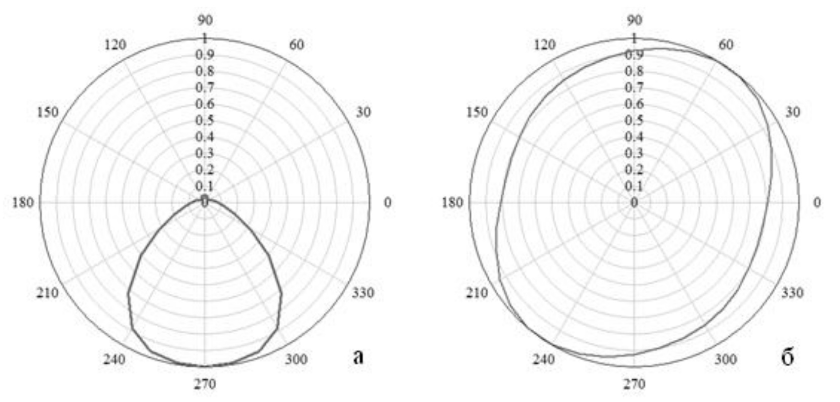 Рисунок 6. Угломестная (а) и азимутальная (б) диаграммы направленности низкопрофильной антенны на квадрокоптере