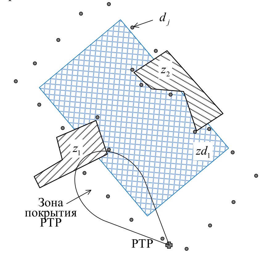 – подмножество установленных ретрансляторов , где , – направление (азимут) ретранслятора, – координаты ретранслятора.