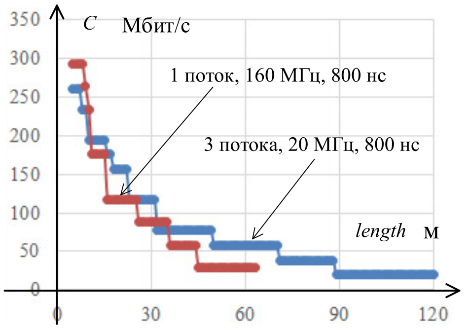 В общем случае пропускная способность радиоканала от датчика до ретранслятора определяется модуляцией и кодированием сигнала (рис. 3) и зависит от наличия прямой видимости, мощности передаваемого сигнала, используемого диапазона частот, коэффициента усиления антенны и количества информационных потоков, а также от вида используемой модуляции. Значение пропускной способности ретранслятора может быть представлено в виде функции от уровня сигнала в точке наихудшего приема сигнала (определяется таблично в зависимости от технологии передачи данных: