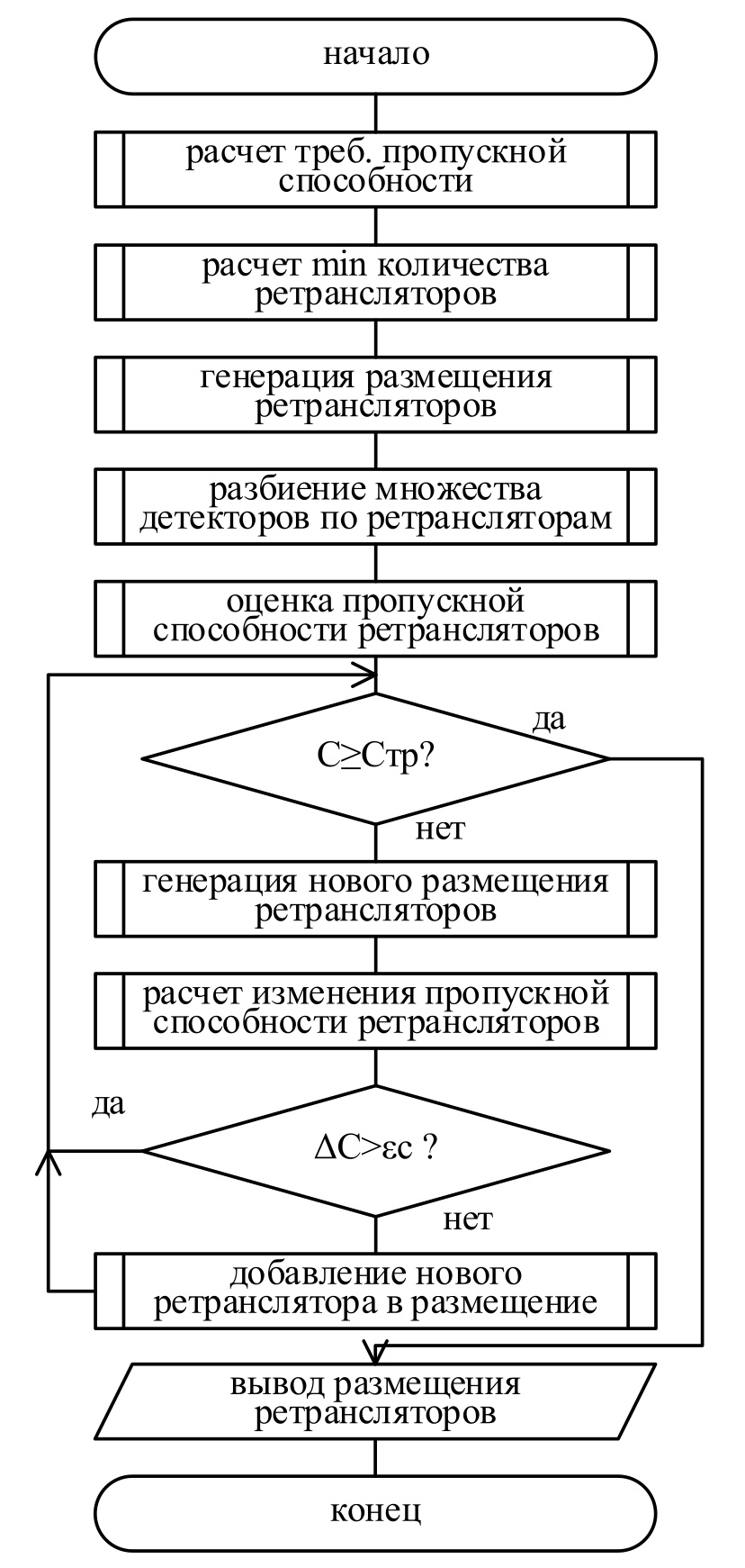 Алгоритм определения мест размещения ретрансляторов представлен на рисунке 3. На первом шаге определяется минимальное количество ретрансляторов с учетом совокупного потока данных от всех детекторов к k-му ретранслятору :