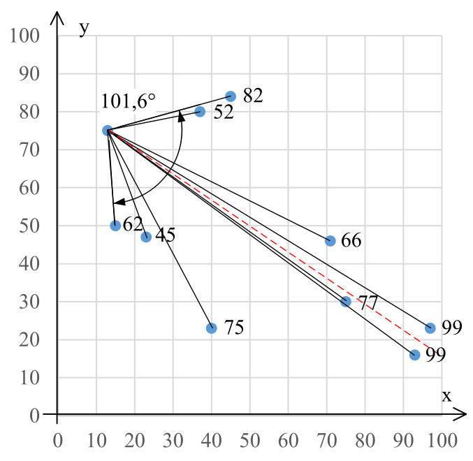 Пример: исходное положение детекторов приведено на рисунке 5. Начальное расположение ретранслятора совпадает с детектором: . Итоговое расположение ретранслятора после 16 итерации: .