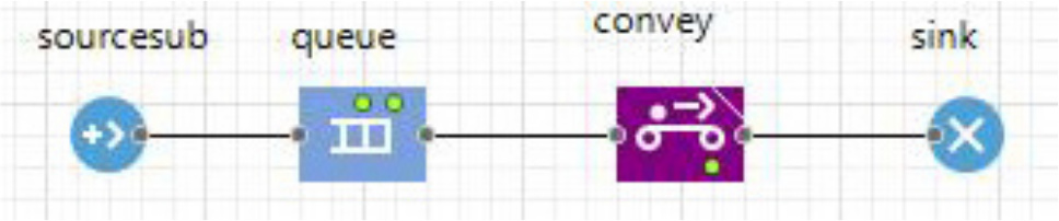 Каждый элемент логической цепи использует информацию об абонентах, которая хранится в классе Sub. Вначале будут реализованы агенты-абоненты с интенсивностью 0,5 в секунду. Затем агенты перемещаются к первому конвейеру с помощью блока queue (он используется для ожидания, если конвейер заполнен). Компонент конвейера отображается на графике с помощью заданных свойств (рисунок 1).