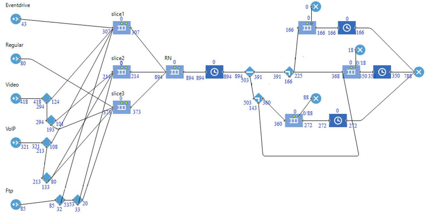 Помимо схемы с приоритетами, можно реализовать схему FIFO (First In, First Out – первый пришел, первый обслужился) и LIFO (Last In, First Out – последний пришел, первый обслужился). Slice1–Slice6 – станции, не разделяемые на приоритеты. Узел RN (radio node) соединяет все станции и работает как счетчик пакетов, которые проходят через него от одной к другой. Обработка пакетов идет по указанной дисциплине очереди. Далее проверяется качество обслуживания – потеря пакетов и задержки в передаче данных. Модель содержит один класс Main (так же, как показано на рисунке 3).