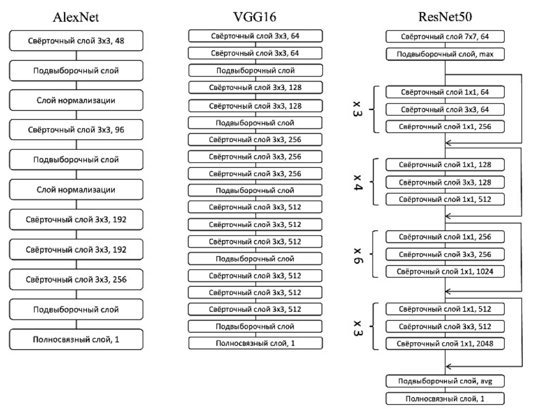 Для решения задачи в работе были использованы три эталонных архитектуры сверточных нейронных сетей, а именно сеть AlexNet [21], VGG16 [22] и ResNet50 [23]. Использование этих сетей обусловлено тем, что модели можно инициализировать весами, обученными на одинаковом наборе данных ImageNet, для решения поставленной задачи. Данная особенность позволит сравнивать результаты обучения моделей в случае их инициализации натренированными весами.