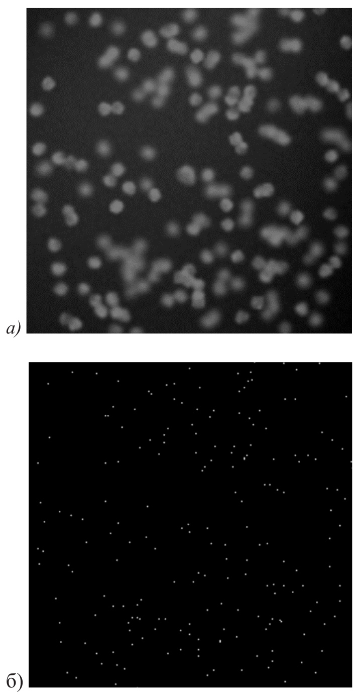 Для решения задачи подсчета объектов на изображениях в качестве данных для обучения и тестирования была взята база изображений бактериальных клеток [25]. Набор состоит из изображений, на которых содержатся бактериальные клетки, подсвеченные с помощью люминесцентной микроскопии (рисунок 2а), и изображений, которые являются аннотациями к исходным данным (рисунок 2б). На аннотациях выделены центры бактериальных клеток исходных изображений.