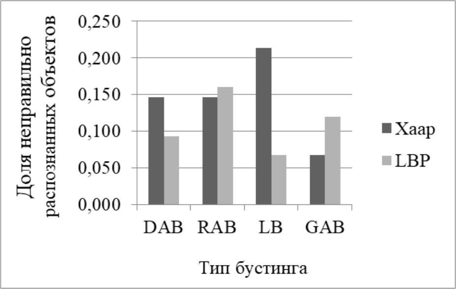 На рисунке 1 представлена диаграмма сравнения эффективности использования типов бустинга применительно к каскадным классификаторам Хаара и LBP. Как видно из диаграммы, доля неправильно распознанных объектов при использовании каскадного классификатора Хаара значительно ниже с типом бустинга Gentle. Однако, аналогичное значение доли неправильно распознанных объектов показал и каскадный классификатор LBP с типом бустинга LogitBoost.