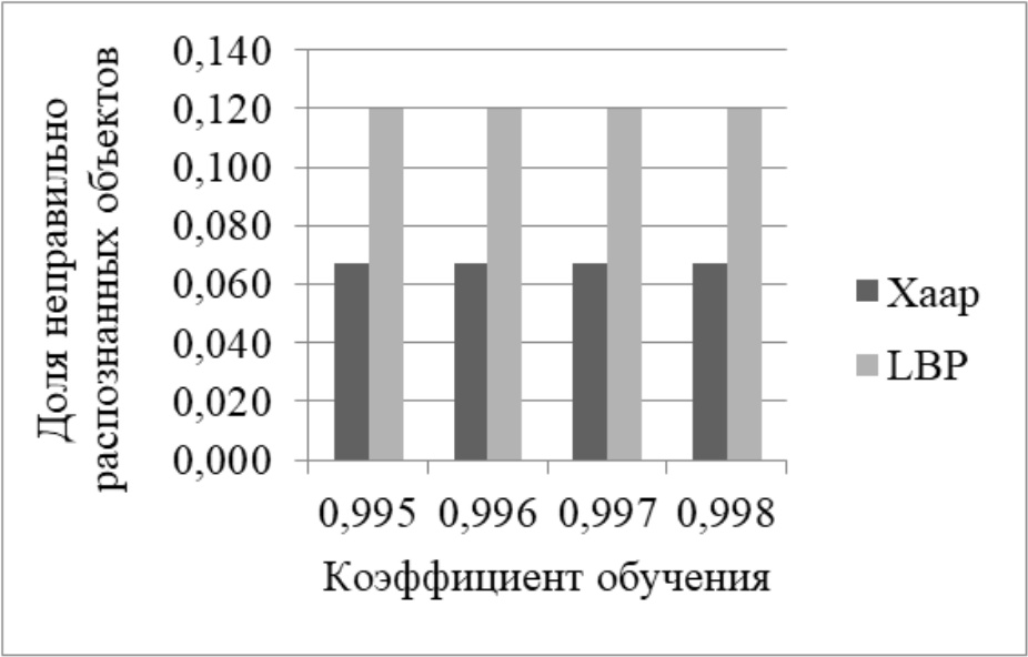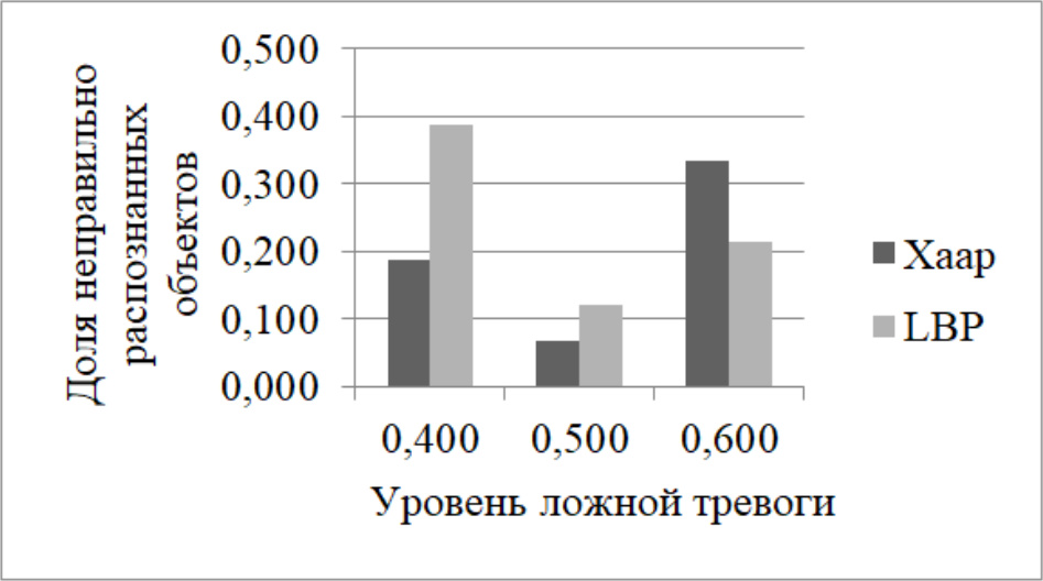 На рисунке 3 представлена диаграмма сравнения результатов тестирования каскадных классификаторов Хаара и LBP при разных уровнях ложной тревоги. Как видно из диаграммы, доля неправильно распознанных объектов при использовании каскадного классификатора Хаара, в среднем, ниже, чем при использовании каскадного классификатора LBP.