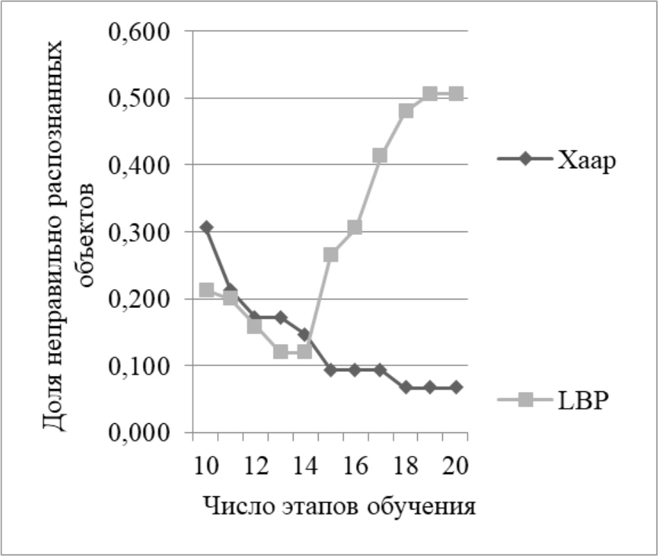 На рисунке 4 представлены зависимости доли неправильно распознанных объектов каскадного классификатора LBP и Хаара от числа этапов обучения. Для каскадного классификатора LBP 13 является оптимальным значением числа этапов обучения, поскольку при числе этапов более 14 классификатор начинает переучиваться. Так же рисунок 4 показывает, что для каскадного классификатора Хаара минимальная доля неправильно распознанных объектов достигается при использовании 18 этапов обучения.