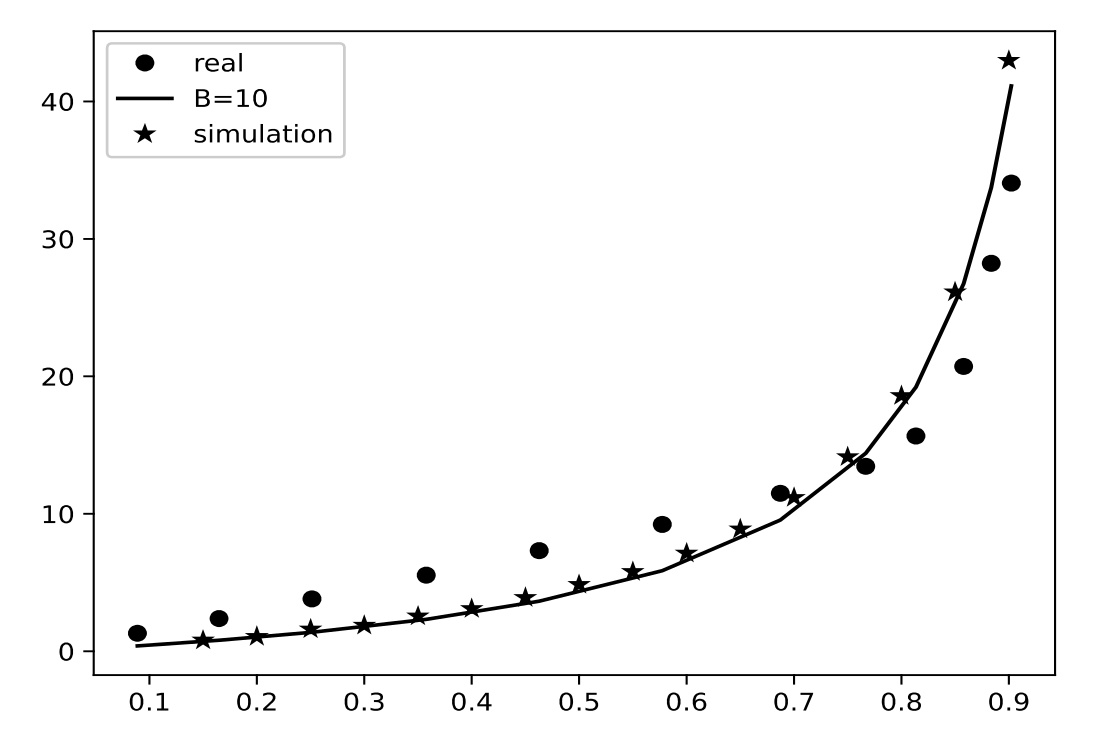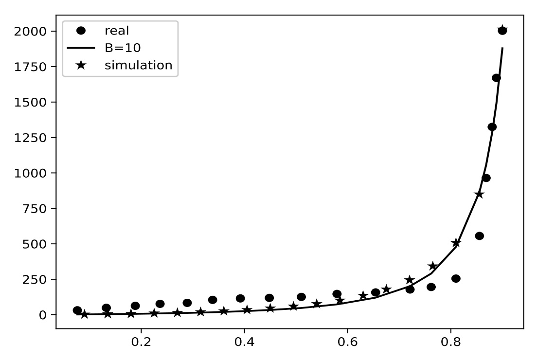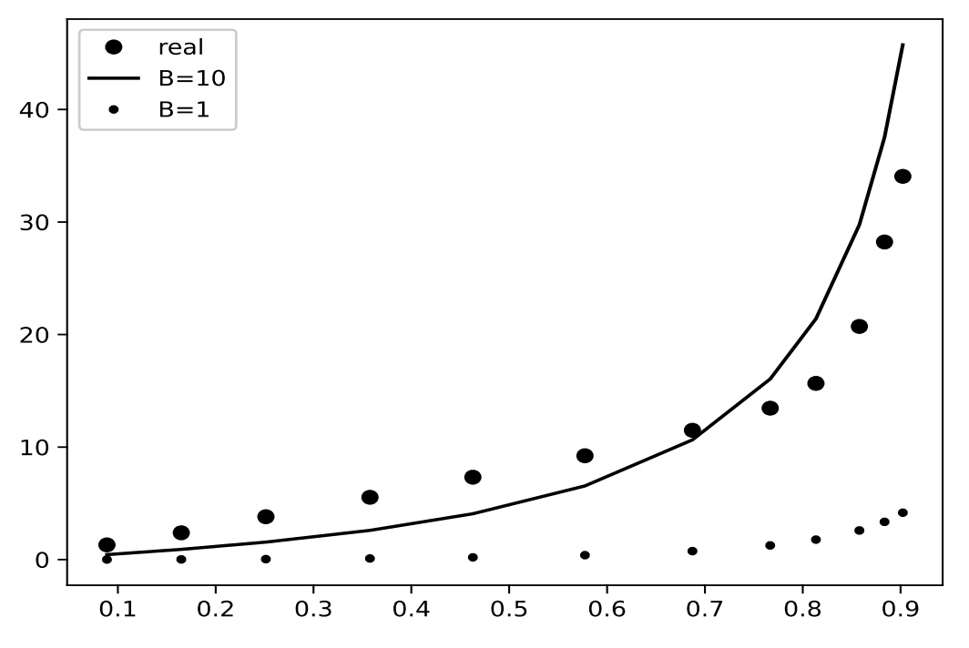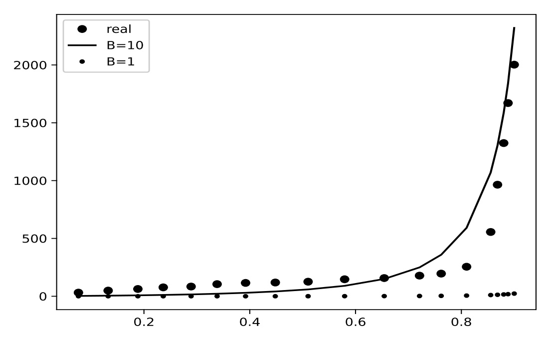 На рисунках 1 и 2 приведены для средней очереди и дисперсии очереди, точки, полученные из реального трафика, использовавшиеся в функции (4), графики зависимостей (1) и (2) для B, минимизирующего функцию (4) и для сравнения графики для ординарного пуассоновского потока. В этом эксперименте использовался трафик от видеокодека стандарта H264. На рисунках 3 и 4 приведены результаты аналогичного эксперимента с видеотрафиком типа vid.