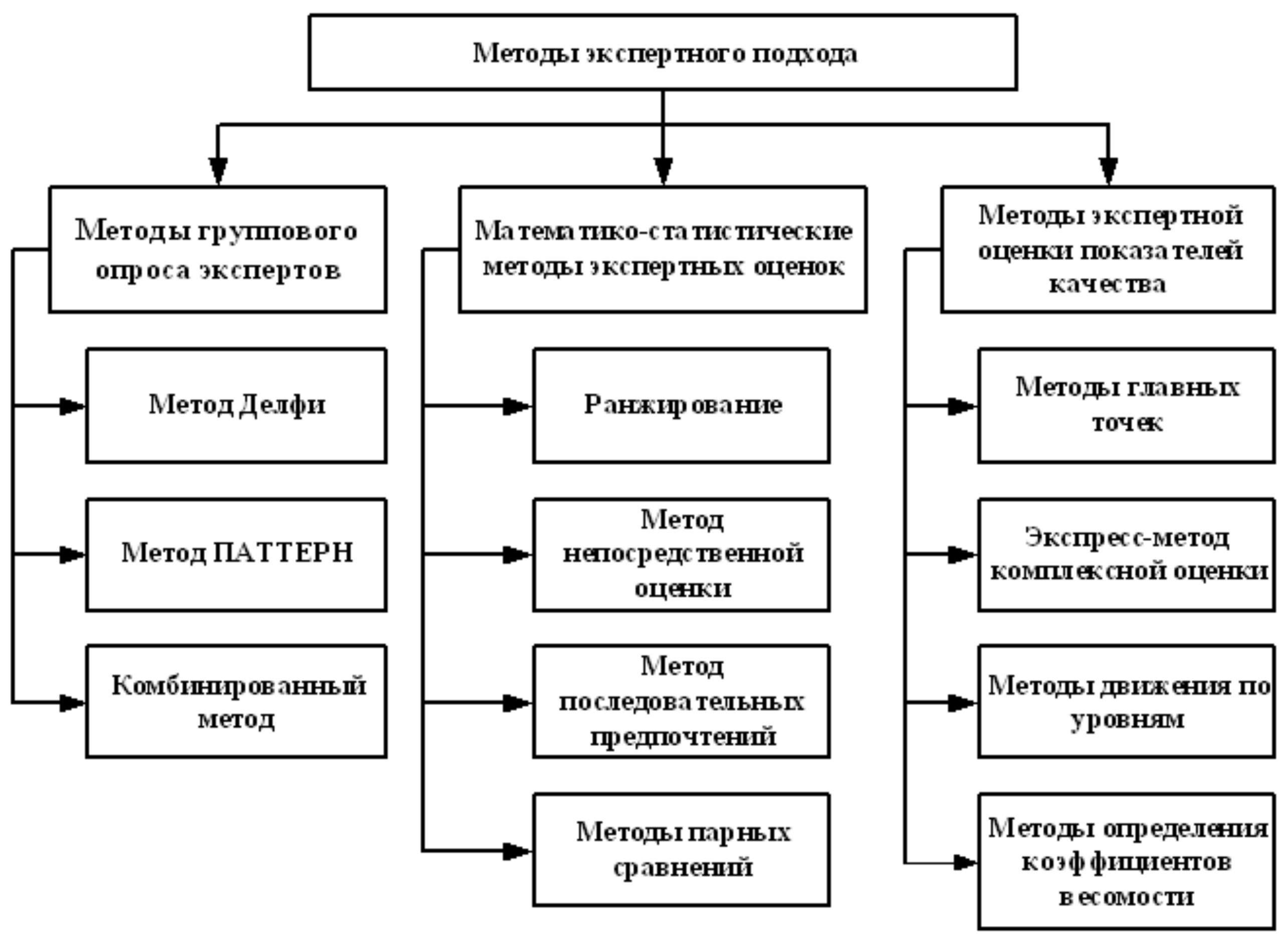 - Методы группового опроса экспертов. Метод Паттерн предполагает коллективную работу экспертов, обсуждение мнений, совещаний, проводимых в несколько раундов, на каждом этапе опросов экспертов не меняют. Для метода Делфи главной особенностью является независимость экспертов и отсутствие влияния на их оценку, при этом каждый раз привлекают новых экспертов. Результаты такой работы подвергаются обработке методами статистического анализа, и формируется конечная оценка.