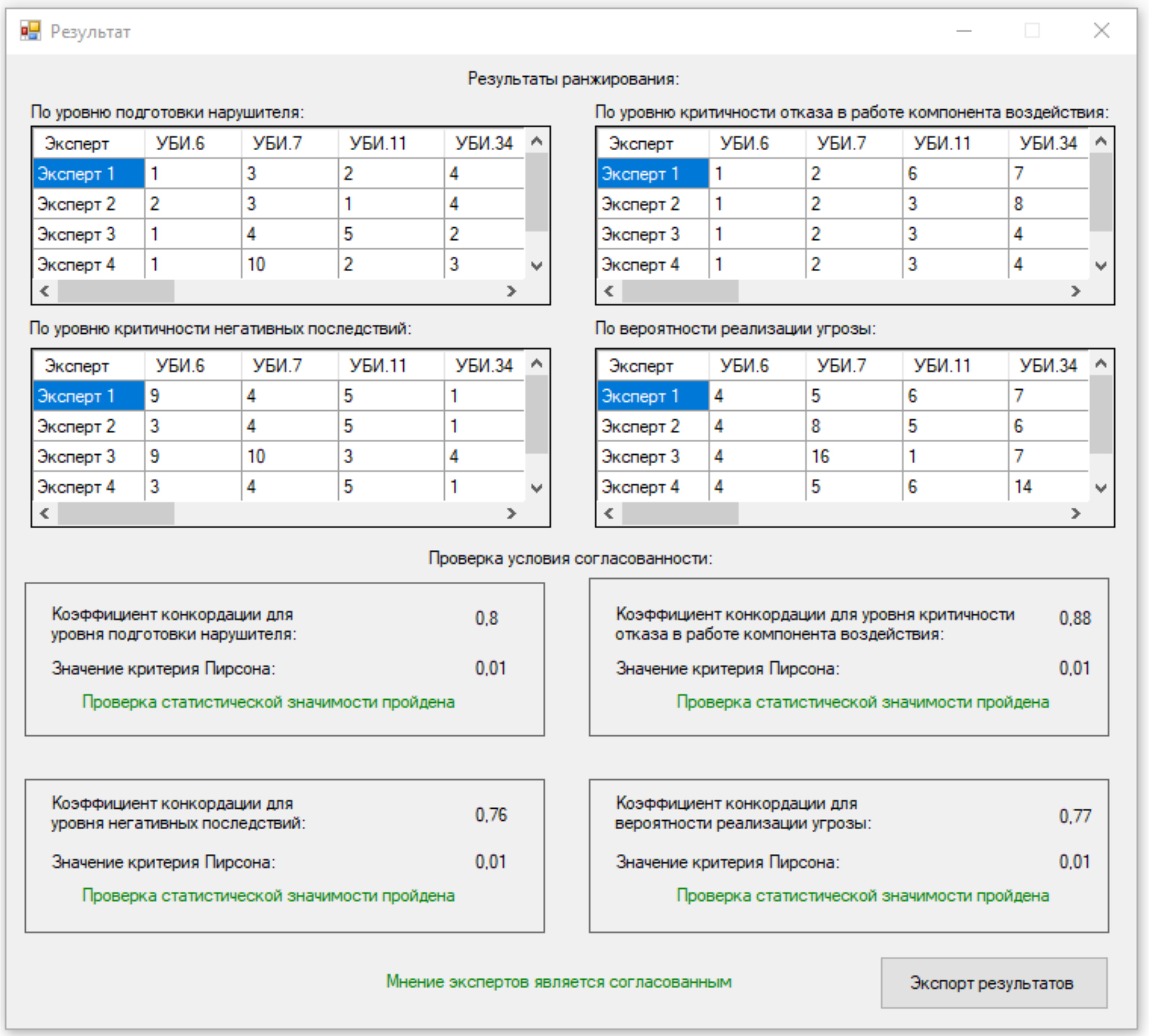 Результатами проведения опроса экспертной группы является обобщенный перечень актуальных угроз для рассматриваемого объекта защиты, а также результат оценки согласованности экспертных мнений. Предлагаемый алгоритм позволяет не только выполнить оценку угроз по выбранным характеристикам, но и сформировать единое экспертное мнение с допустимой степенью согласованности, основанное на компетенциях специалистов разных направлений в области информационной безопасности.