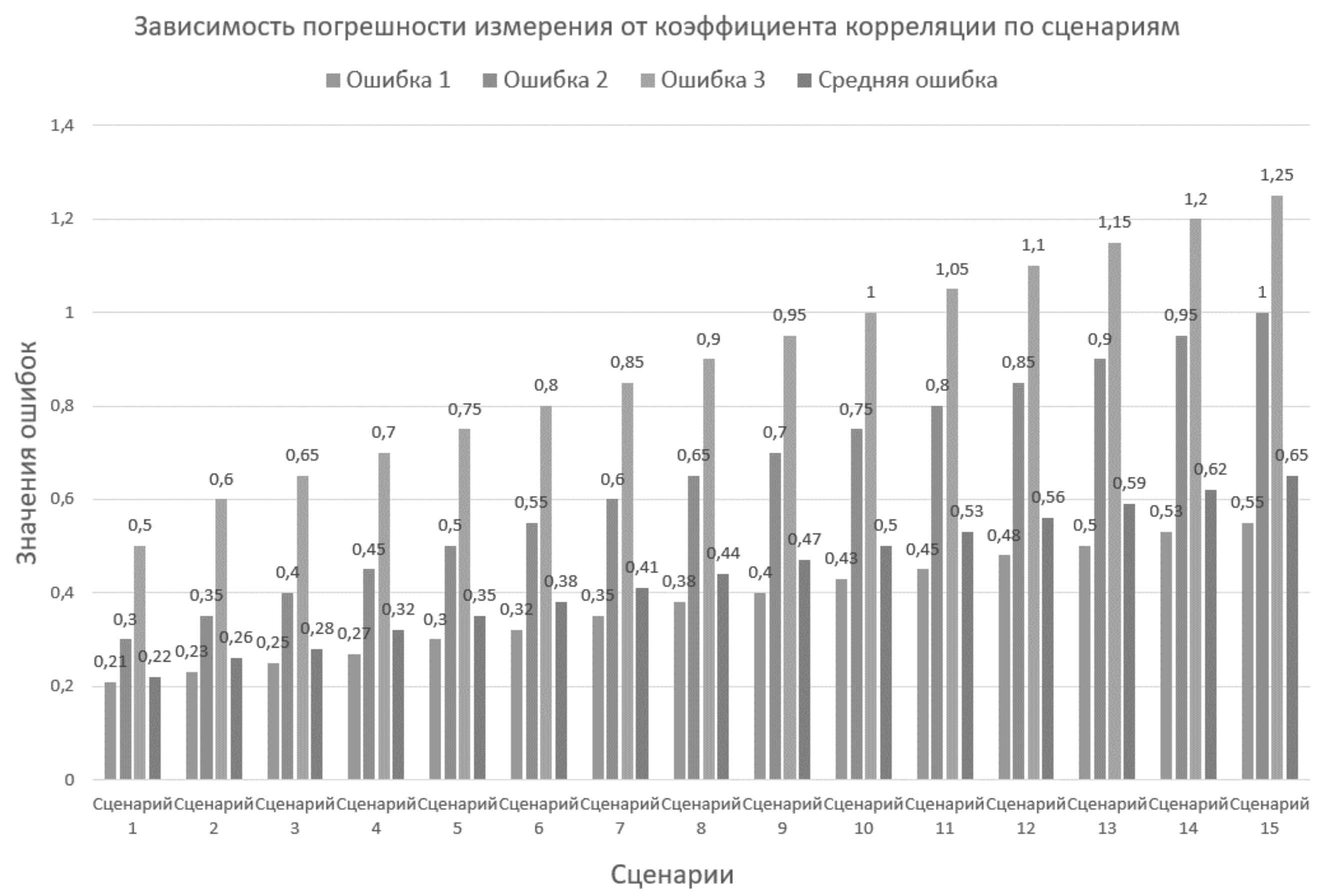 Представленные данные в сценариях и построенный на их основе график наглядно демонстрируют зависимость точности (средней погрешности) измерения глубины с использованием стереоскопической системы от качества сопоставления стереопары изображений, выраженного через среднее значение коэффициента корреляции Sij.