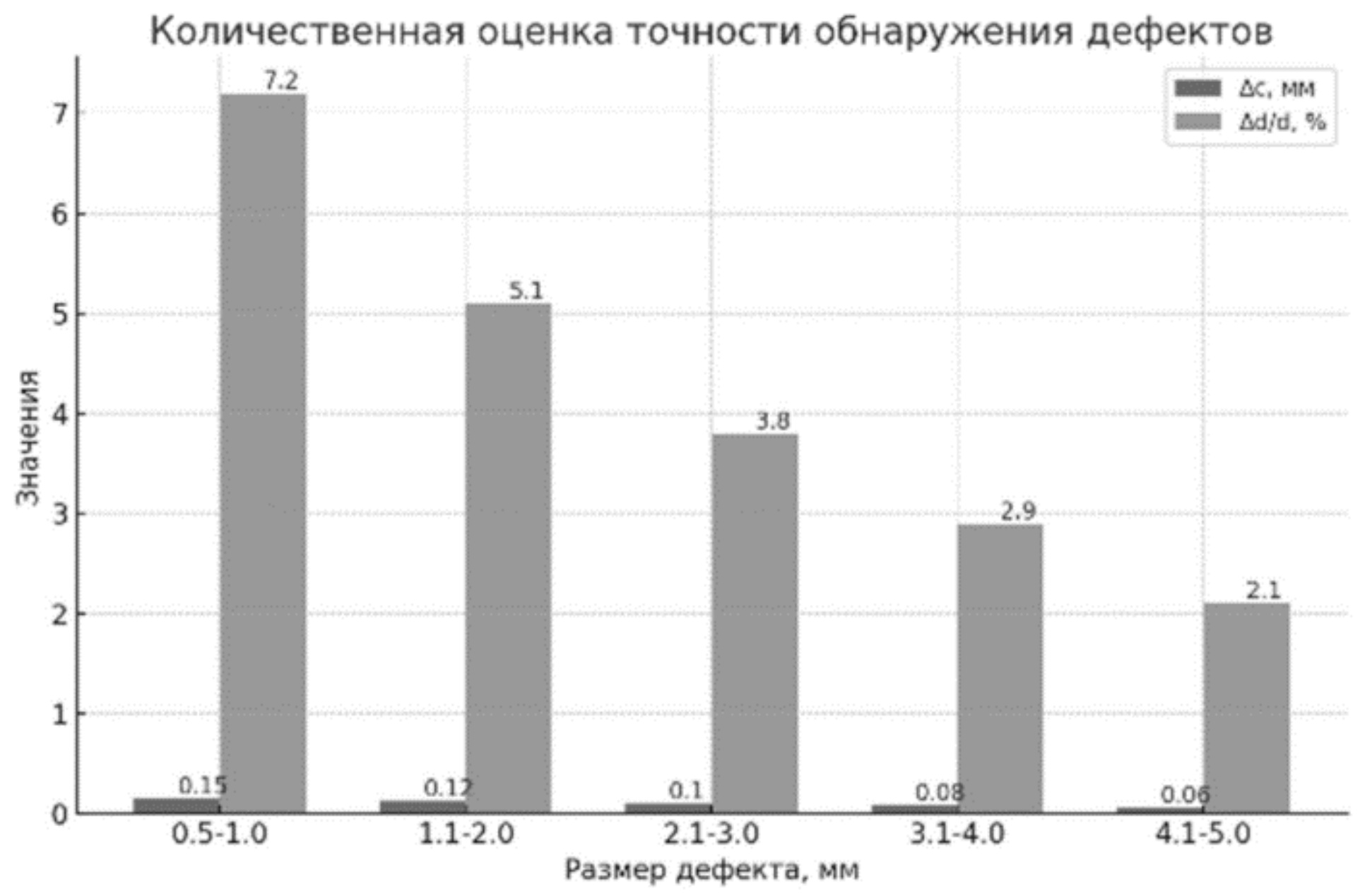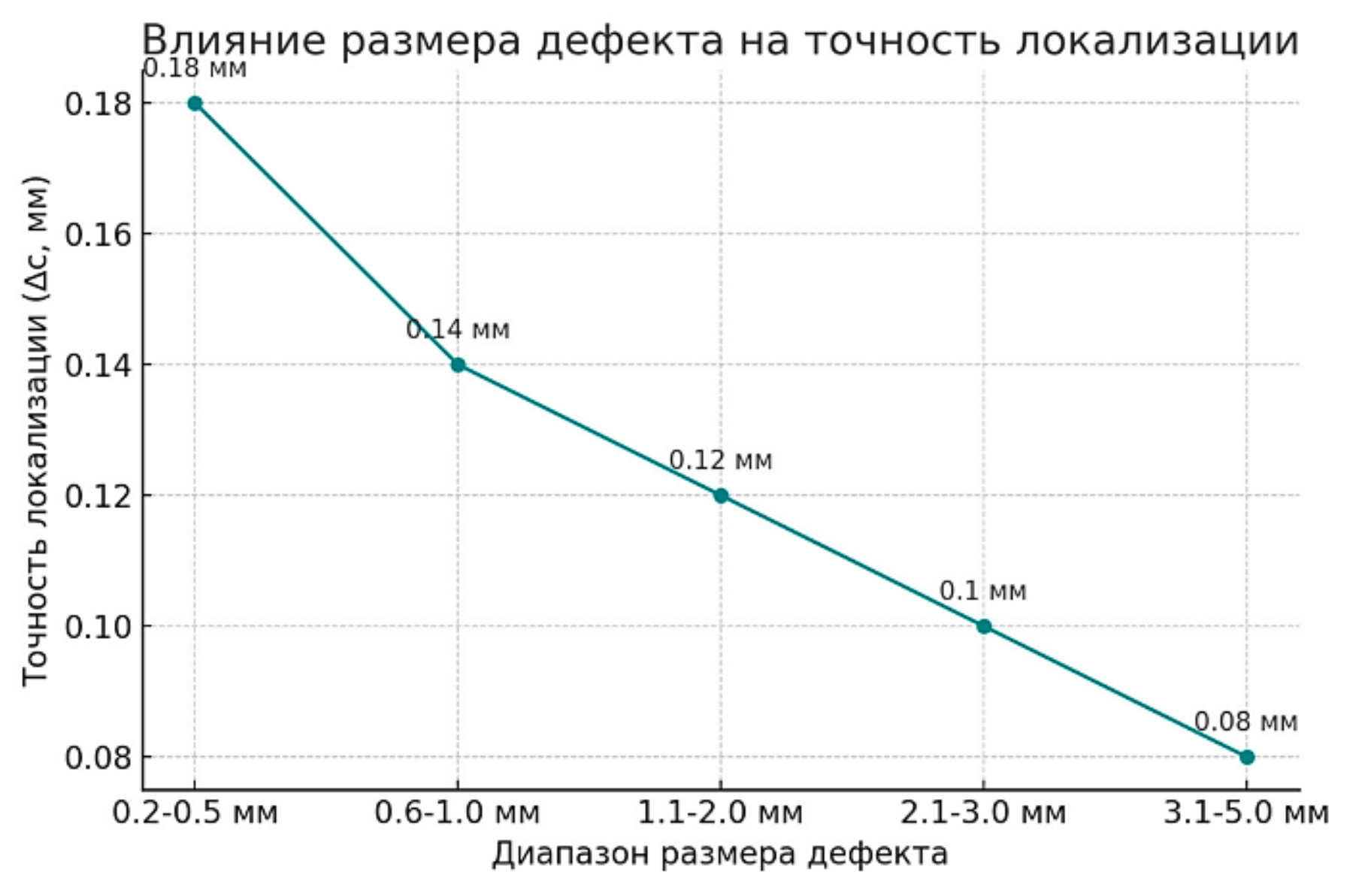 Таким образом, достигнутая точность локализации дефектов составила 0,1 мм и менее, точность измерения их размеров обеспечивает погрешность менее 8% для дефектов 0,5–1 мм и менее 3% для дефектов свыше 3 мм.