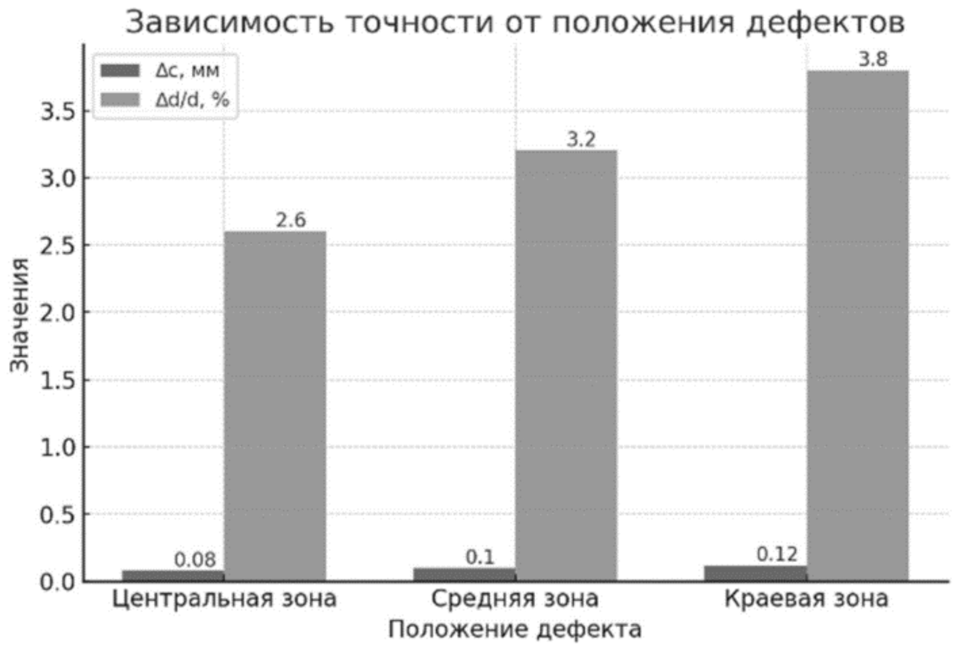 Рассматривалась также зависимость точности от положения дефектов по радиусу и углу цилиндра [15]. Установлено, что наименьшие значения погрешностей (∆с = 0,08 мм, ∆d/d = 2,6 %) наблюдаются для дефектов, расположенных в центральной зоне с радиусом 20–50 мм от оси цилиндра. Для краевых участков эти величины возрастали до 0,12 мм и 3,8 % соответственно.