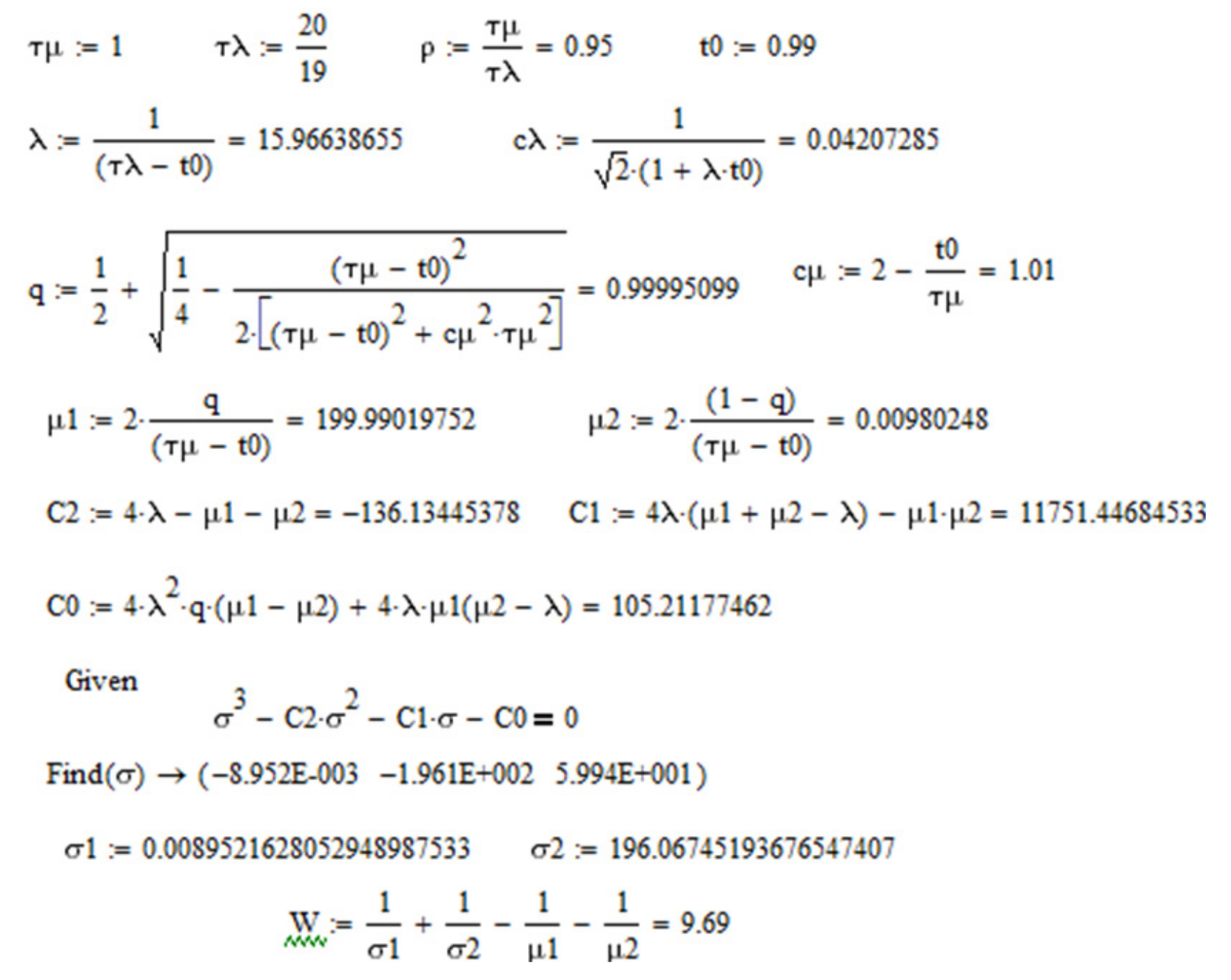 На рисунке 1 представлен вариант расчета среднего времени ожидания для случая высокой нагрузки, равной 0,95 при коэффициенте вариации времени обслуживания, равном 2 и параметре сдвига 0,99. Из программы на Mathcad хорошо прослеживается алгоритм применения расчетной формулы (1). В таблице 1 представлены результаты серии численных расчетов в Mathcad.